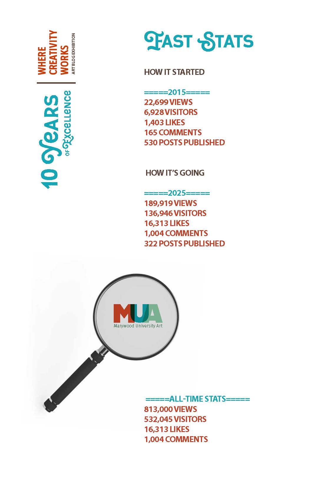 Prof Sue Jenkins: Ten years ago, in 2015, when I designed and built Where Creativity Works as an art recruitment blog, my primary aim was to create an online art community that supported our students in their creative artistic growth and provided general information about our majors for anyone considering studying art at Marywood. And now, ten years later, what began as a simple undergraduate art blog has blossomed into a unique global arts platform of creative expression, connecting our students with art enthusiasts around the world.