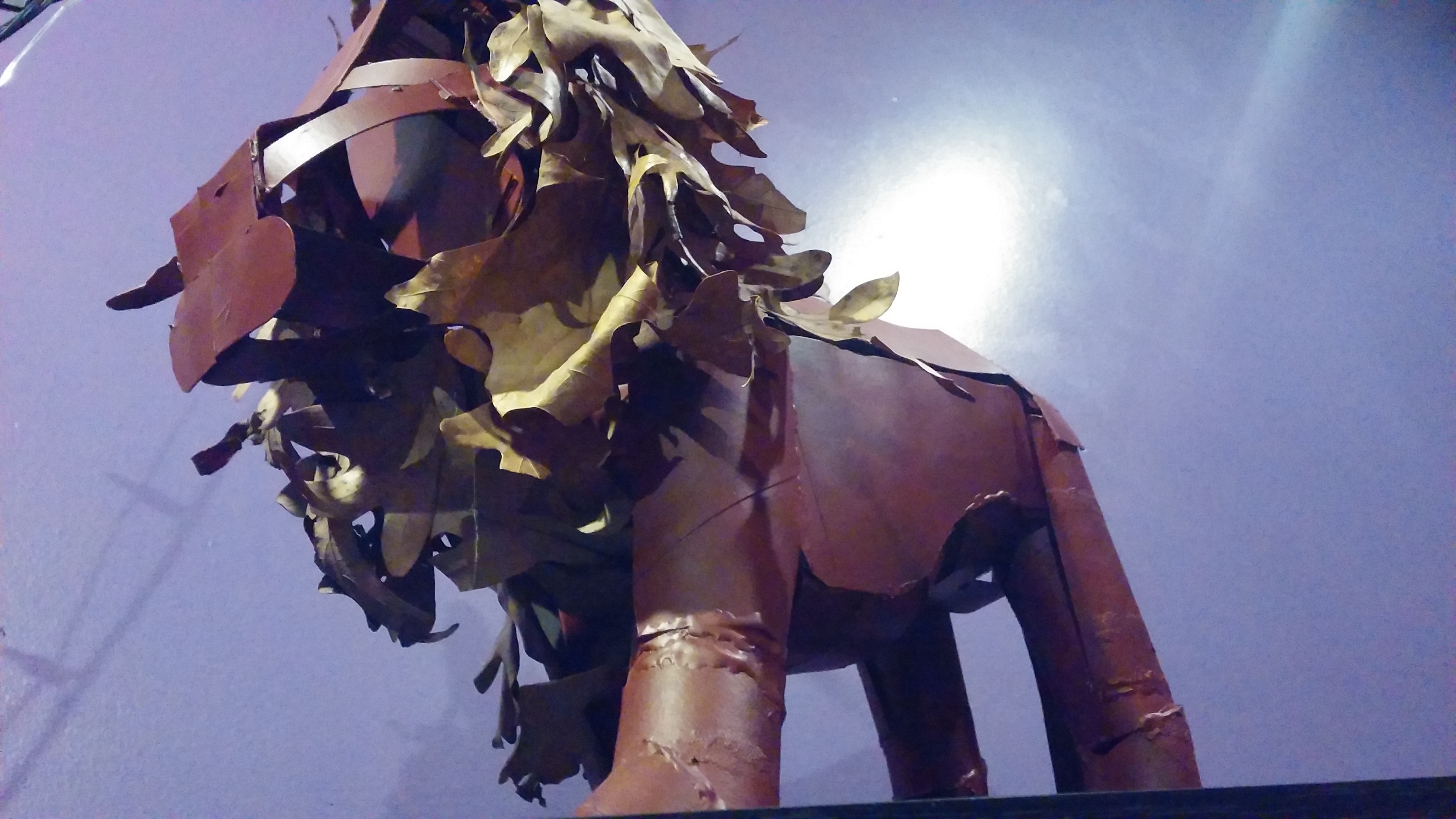The two liter bottle was used for the shape of the body which I had to cut into the form of the body. For the lion’s face, tail, and parts of the torso I cut out cardboard and shaped it to each part respectively. I used the toiler paper rolls to create the legs, which I made to look as if the lion was walking. After these parts were put together I painted the whole thing in brownish red paint. Finally I glued on the leaves for the mane and tail.