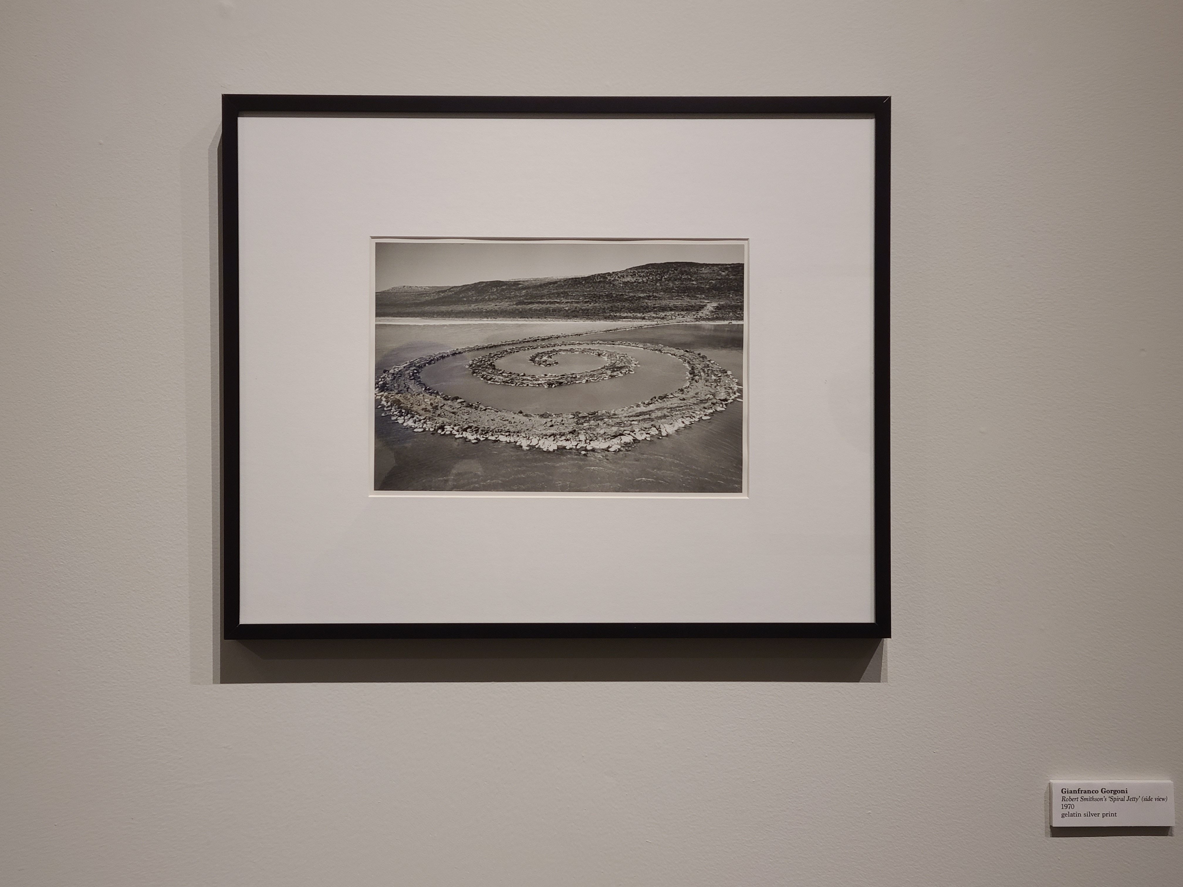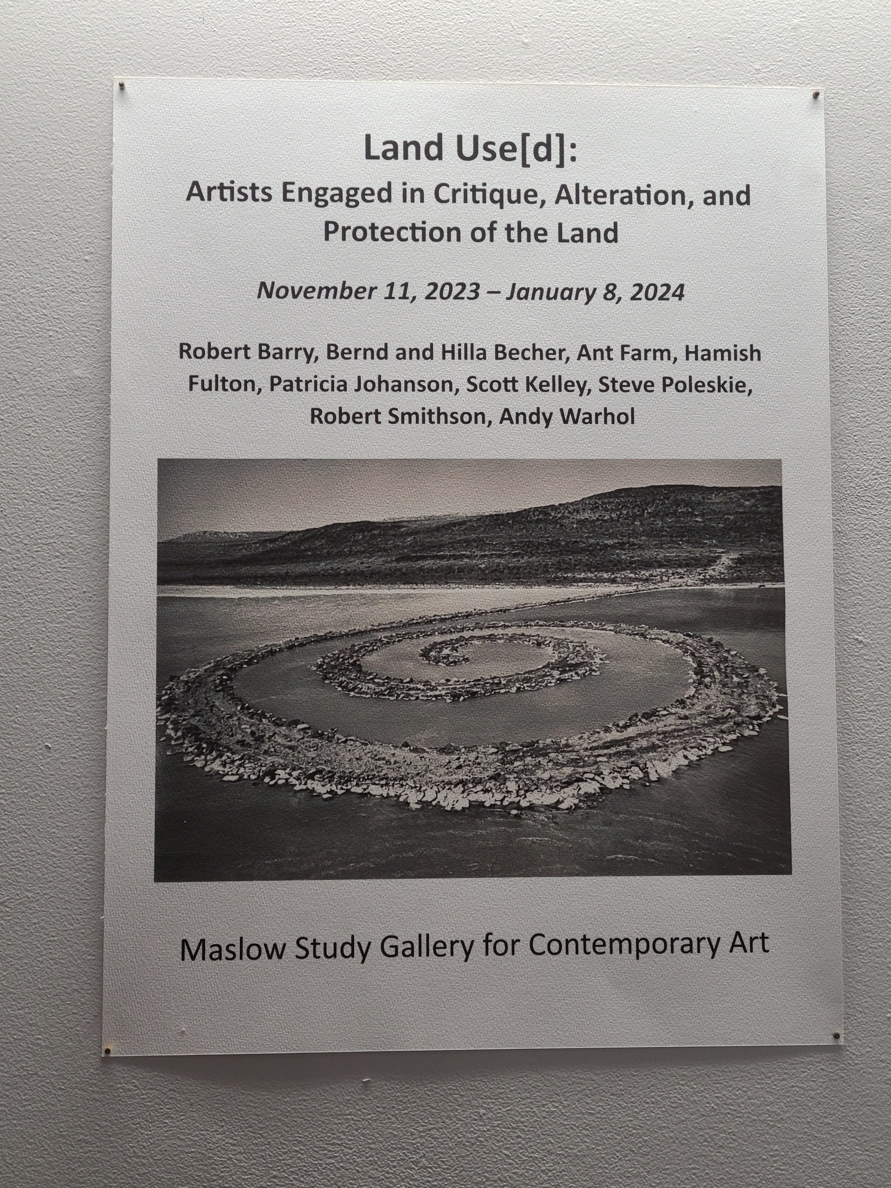 Currently, in the Maslow Gallery is a collection that sparks a conversation about where land and art intersect. The collection entitled “Land Use[d]” features several famous artists including Andy Warhol, Gianfranco Gorgoni, Robert Barry, and more. The piece that caught my eye the most was the photograph by Gorgoni. The subject matter was of Spiral Jetty, which I had seen before in my History of Modern Art class when we talked about the idea of land art. Land art also called Earthworks is the idea of making art from the earth in one specific location. Even the material would be from the earth such as dirt, stone, or water. The actual installation of Spiral Jetty was made by Robert Smithson. While the work of Smithson has had a long legacy, other artists who made land art made it with the intention of it being temporary. The commonality with these artists was to leave a mark on the earth’s landscape.