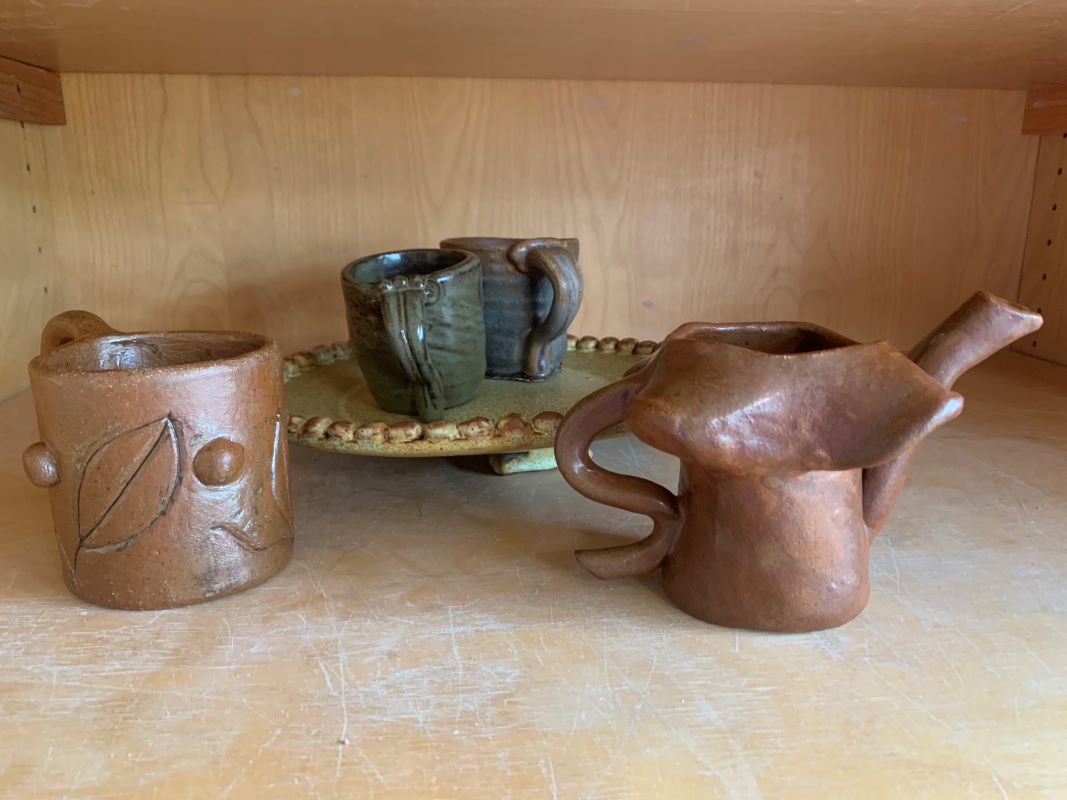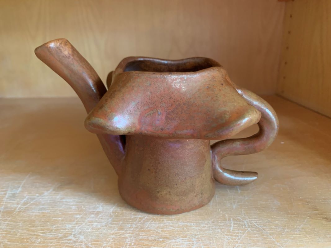 Besides the two mugs that I learned from, the rest of my pieces came out nicely. The mushroom looking tea pot came out with the color brown that I was expecting and the other green mug came out correct. The serving plate, on the other hand, came out with a yellow and brown that I was not completely expecting. For this piece though, I did know it was going to be yellow and brown, I just didn’t know how yellow or brown. I do however enjoy the outcome. Now that these projects are finished, I get to make new ones! I am unsure as to what I will be creating next, but I am excited to explore more ways to create objects whether it’ll be practical or abstract.