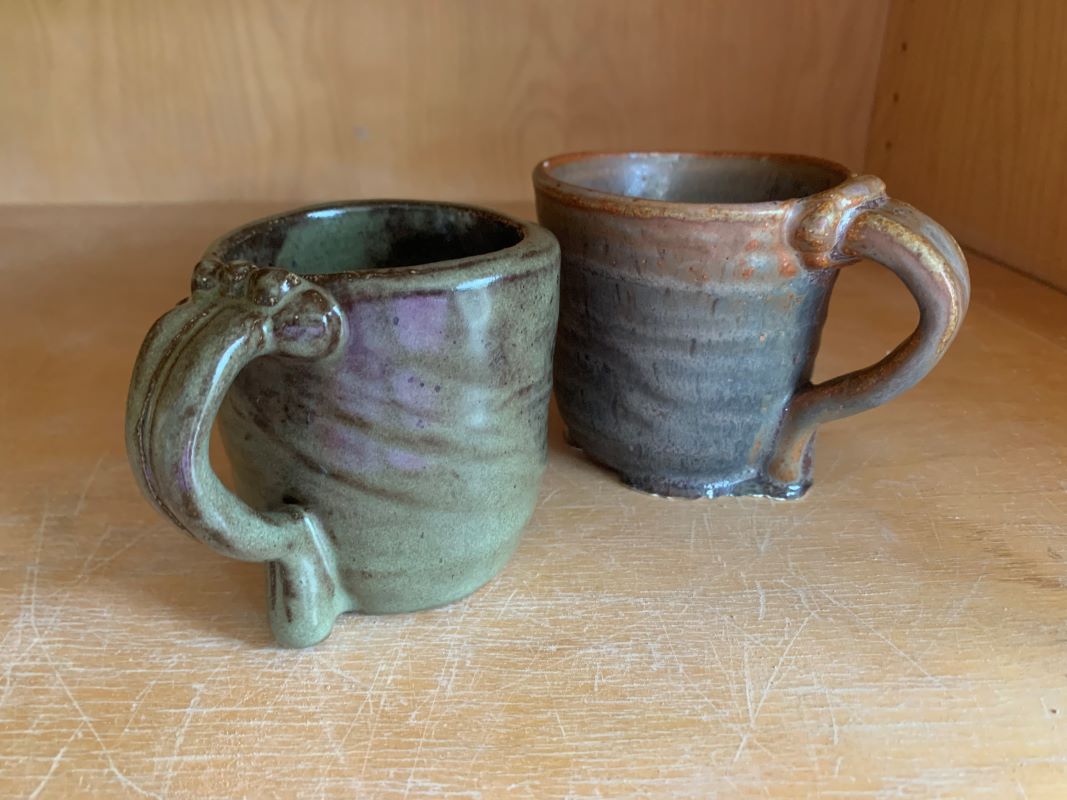 In regards to the projects that I have been working on, they are finally done. It is safe for me to say that I am mostly happy with how they turned out. I say that I’m only mostly happy because two of my mugs came out differently than I thought they would. The one mug, with the blue glaze (right mug in the picture below), had too much glaze on it so when it was fired the excess glaze was heavy at the bottom and created extra material at the bottom.
