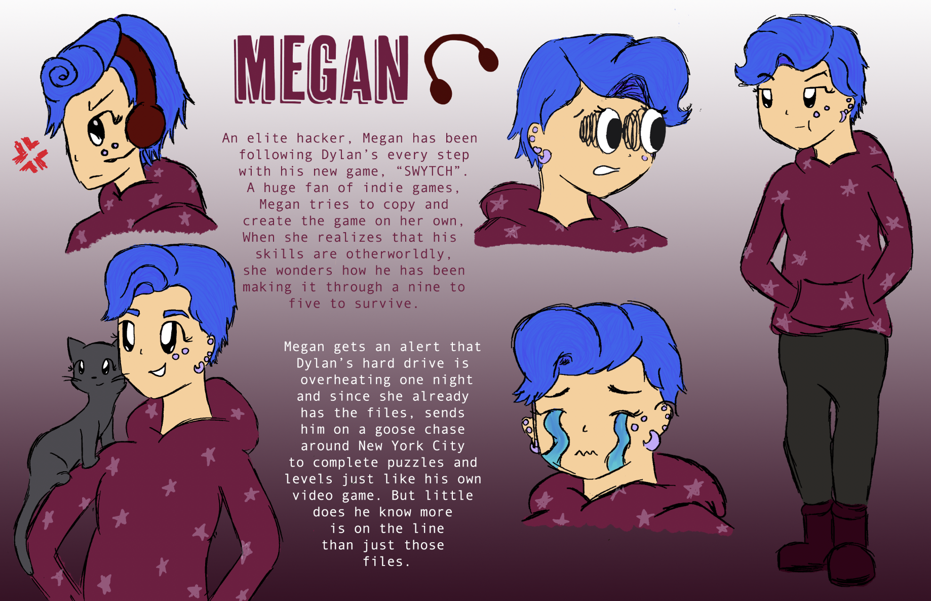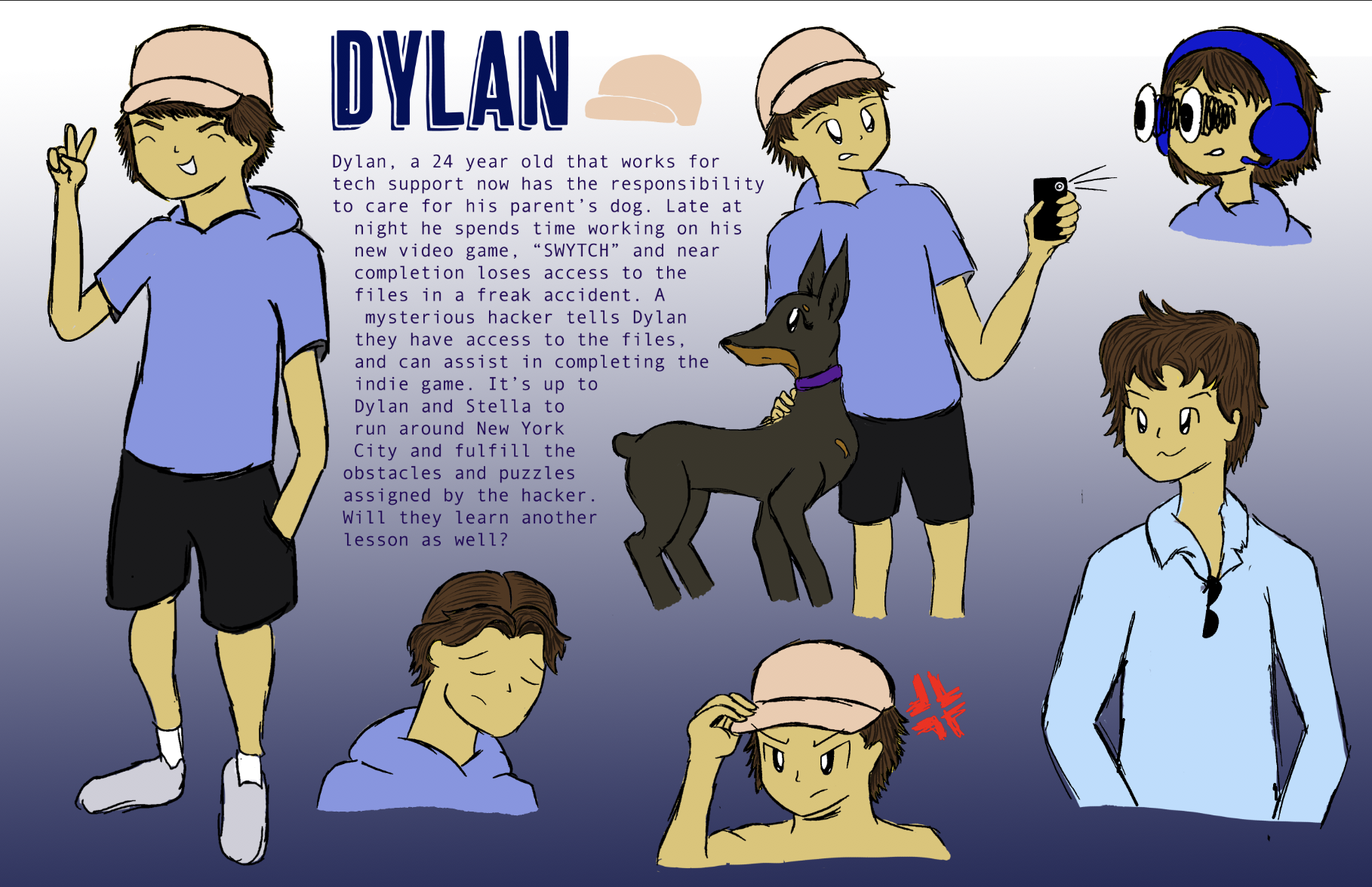 For my Digital Illustration class, we had to start the semester coming up with a story, and transferring it to all the projects we do the semester. My story was based on a made up video game, and the first project was character design sheets. That was my favorite giving them emotions and having personalities, and would prove to be helpful in the upcoming projects!