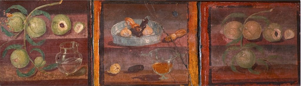 As mentioned earlier, connotations of fruit have saturated history as far back Ancient Egyptian times. Tombs often contained depictions of various foods, welcoming nourishment into the Egyptian afterlife. In ancient Italy, fruit was often depicted in sculpture and painting, including this Fourth-Style fresco in the now defunct seaside getaway for the Roman bourgeoisie known as Herculaneum.