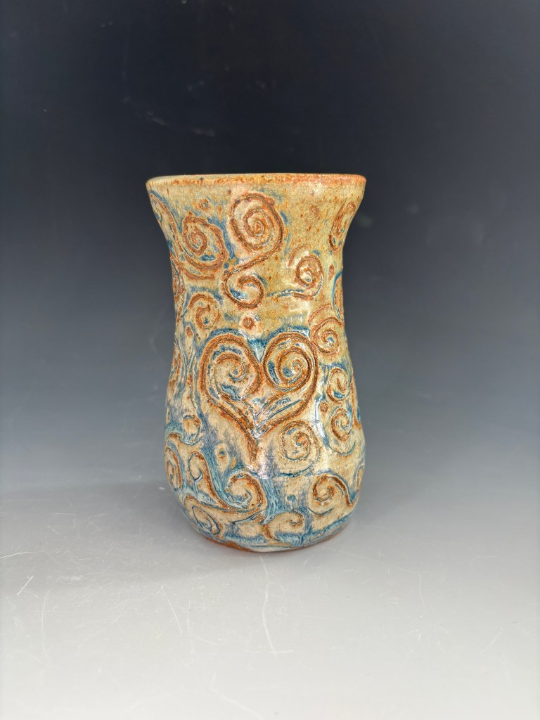 These next photos are of a pot I made where I experimented with carving and a glaze I made in class from a recipe on Glazy. I’m super happy with how this one came out because the glaze drips perfectly to contour the carvings in the clay. To achieve this I used wax resist in the carved areas to ensure that the glaze would not drip into the carvings but rather around them. It is the first time that I made something like this and I couldn’t be happier with the outcome!