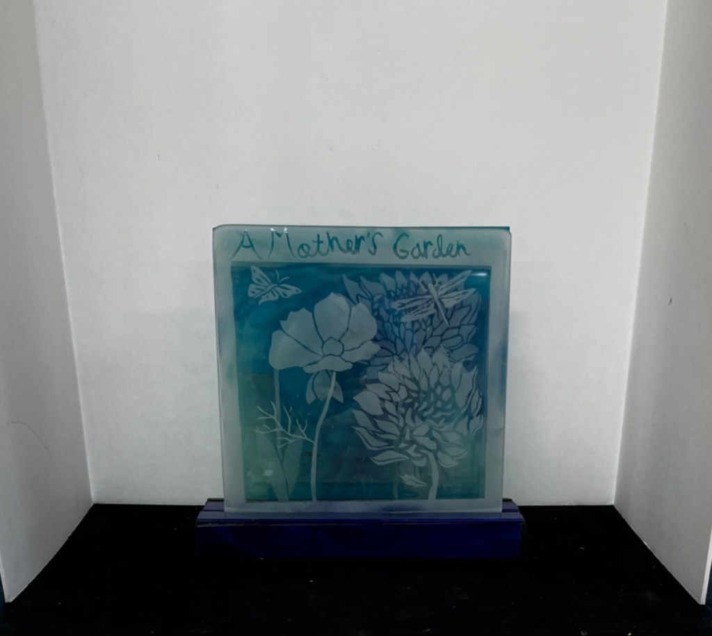 This is I piece I worked on for weeks in my sculpture class. It is three different panes of glass in a wooden stand that has piece of blue glass attached to it. The first pane of glass (the one placed in the back) is a beautifully colored glass, its is green with swirls of blue. The next two ones of glass are clear with designs sandblasted into them. The second pane (the one placed in the middle of the three panes) has two flowers sand blasted into it. The flowers are a snowdrop, the flower of January, and a carnation, the flower of November. These two flowers are the birth flowers of my older brother and myself. The third pane (the one placed in front) has two flowers, a butterfly, a dragonfly, and the words “A Mother’s Garden” sandblasted into it. The two flowers are a cosmo, the flower of October, and another carnation, the flower of November. These two flowers are the birth flowers of my two younger brothers. Butterflies, specifically monarch butterflies, are really important to me and dragonflies are really important to my mom which is why I included them in this piece. The base is made out of wood that I painted black and than attached different pieces of blue glass to.