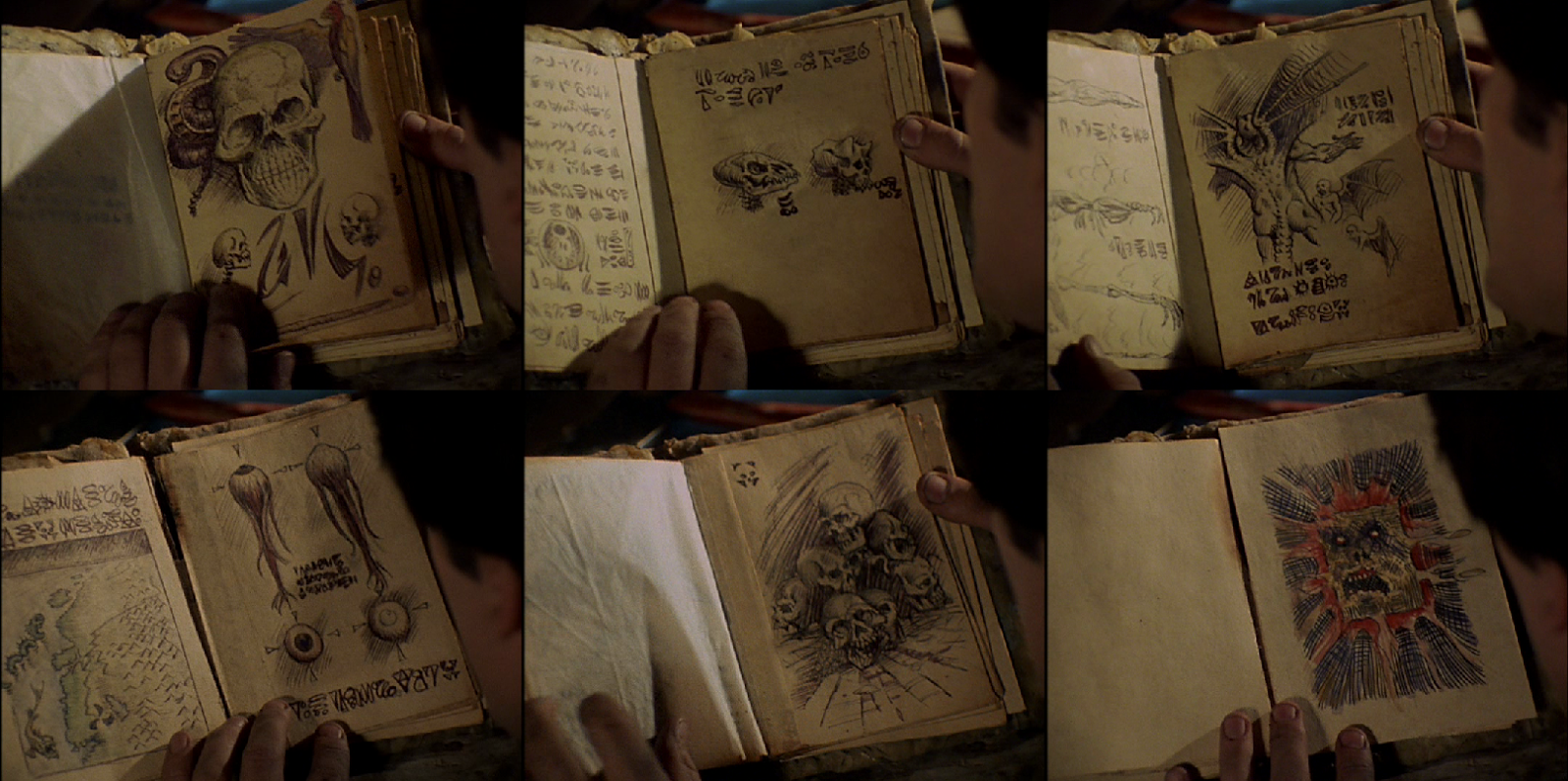 The illustrations in the Book of the Dead are very appropriate for the tone of the movie and the whole look of the book makes it recognizable and intimidating. Once its opened the scrawled text and graphic illustrations bring to life what is to expect from the film… a blood filled adventure with some crazy zombies.