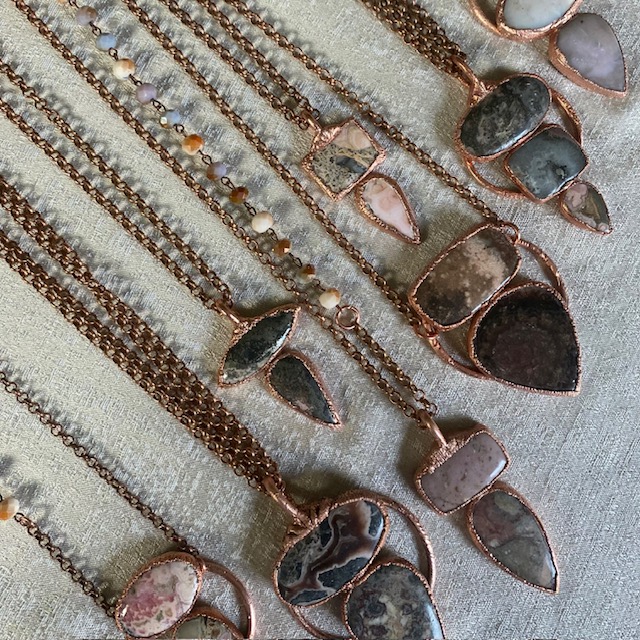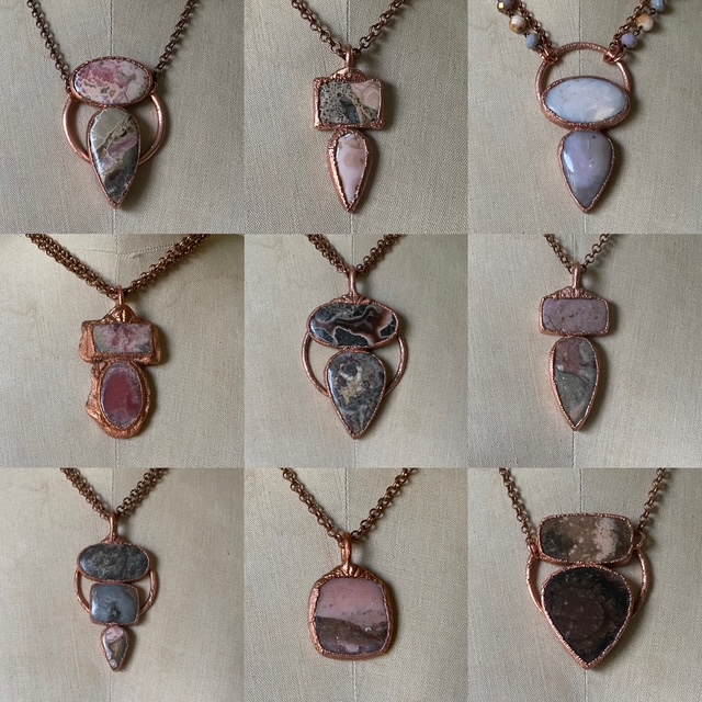 A: The collection from start to finish spanned over 8 months as I worked on one piece at a time. Once the pendants were complete copper chain was added.