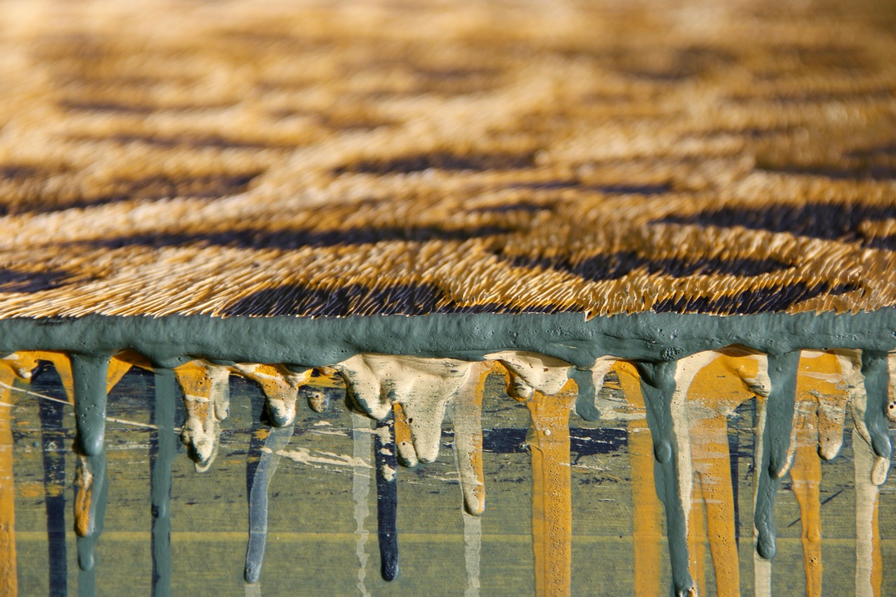 In her series “WILD,” Jensen uses her technique to create images of animals. This piece, DISPLACED, depicts a leopard. I really love this one because of the contrast between the orange fur and the blue-green background. Jensen provided us with close ups of these works, allowing us to truly see the detail she puts into them. The marks made through her carving help create the illusion of real fur, adding to the realism of the piece. This piece has 59 layers of acrylic paint and it is obvious that she included several different colors and tones as she went. I can’t imagine the incredible planning and thought this technique requires!