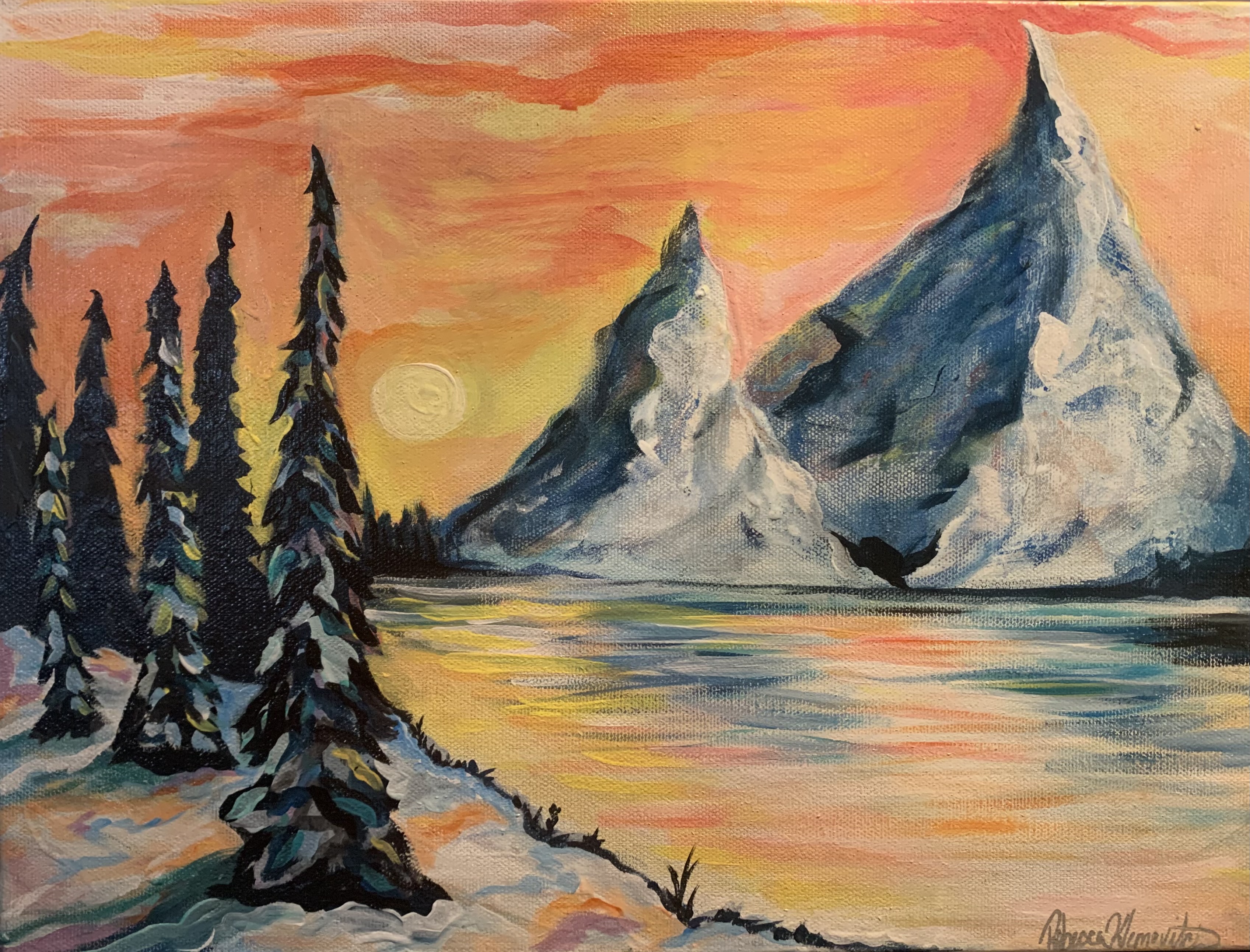 Starting this painting, I knew I wanted to include snowy trees and mountains. Before color blocking on the canvas, I went digital and did a quick sketch of what I intended my layout to be on Procreate. As I started painting there was multiple times I completely wiped away my canvas and restarted. My color pallet, style, and layout was changing consistently, and eventually I landed one I enjoyed.