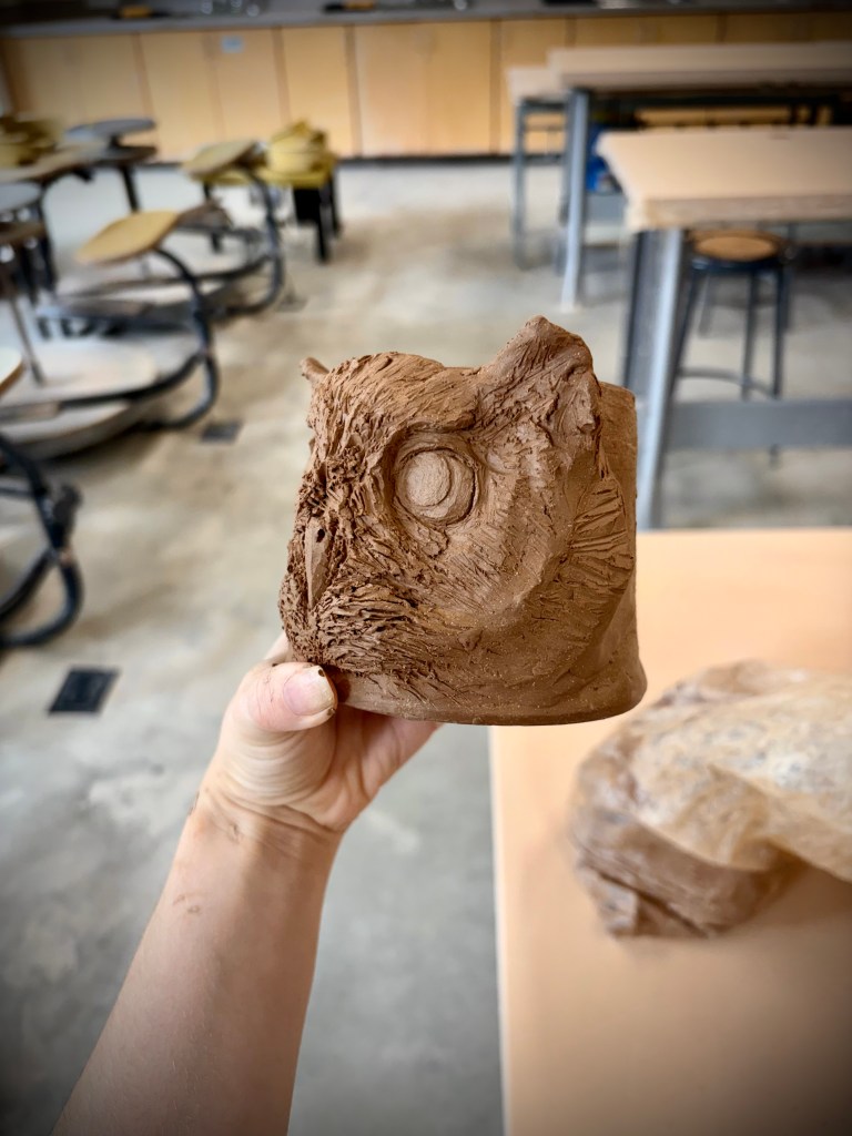 The first piece is wholly 3D. Since I had to practice on the wheel, I kept one of the cylinders to sculpt something fun on top. My grandma wanted an owl pot, so I figured this would be a perfect opportunity. Considering it only took one class to sculpt, I think it turned out pretty nice. I based it on a screech owl, since I heard one by surprise recently, and it was super cool.