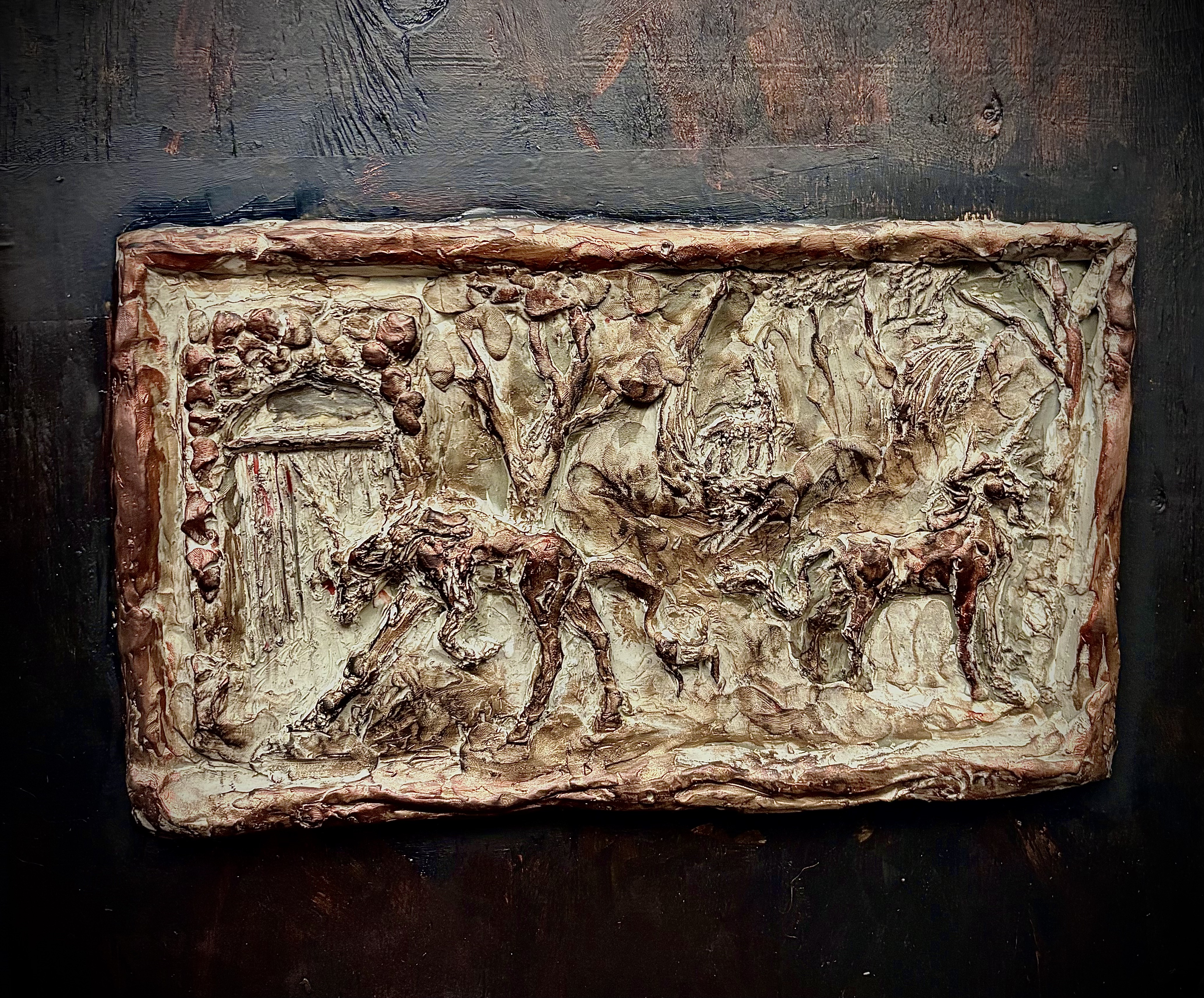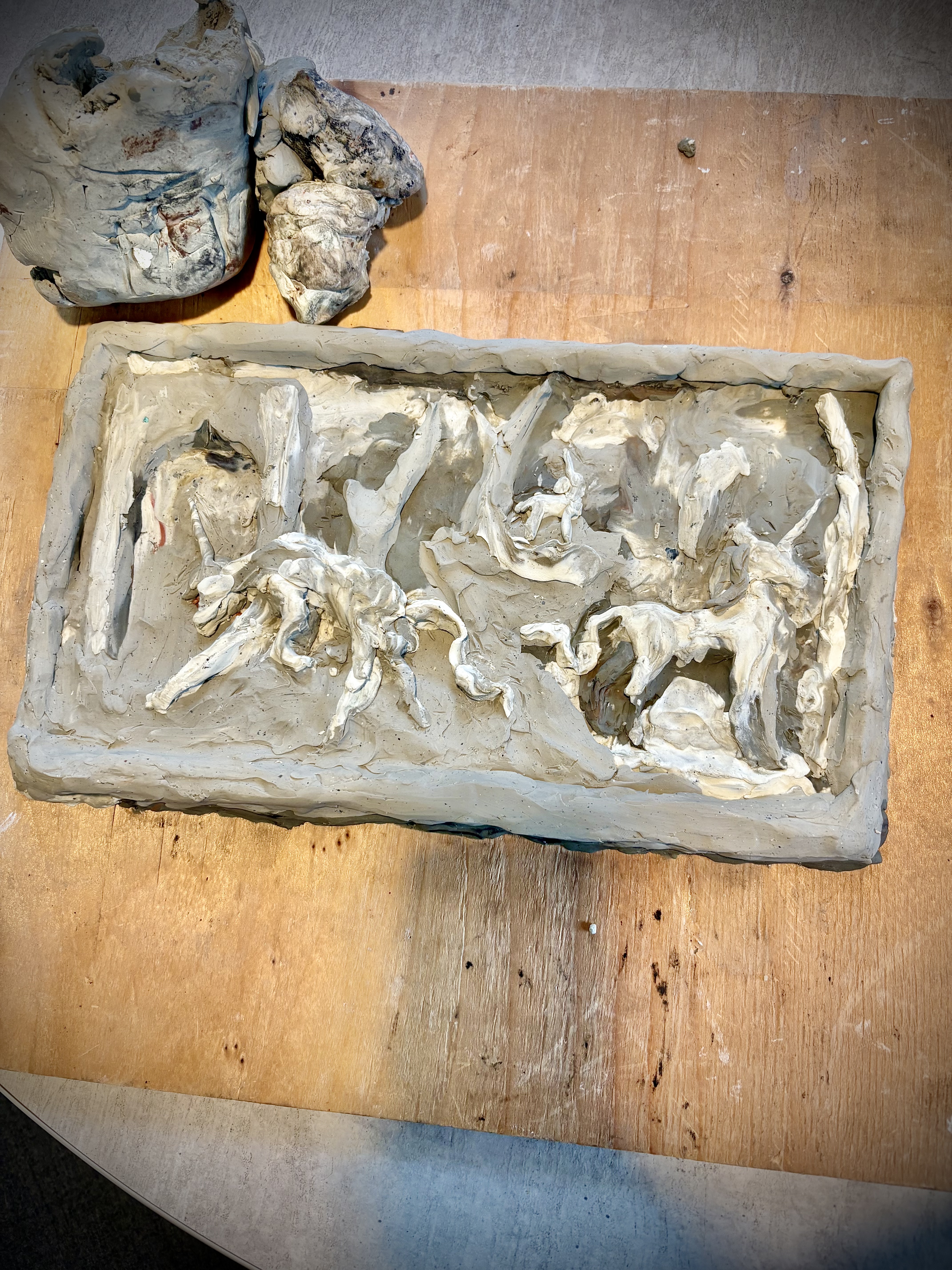 This piece is like a union of 2D and 3D. It’s on a flat surface, but the figures jump out at you! This is called a relief, and I’m pleased with how it’s coming along so far. The piece isn’t done. It’s more like a proof of concept. I sculpted it out of oil-based clay. Soon we’ll make a plaster mold of it, cast it in bronze, and then I can file it down and detail it further. Right now, the piece almost has a sketchy feel, despite being made of clay. I love keeping rough sketches and edges in my 2D art, so this implements that in the 3D space. I’d also never worked with oil based clay before, so this piece taught me a lot.