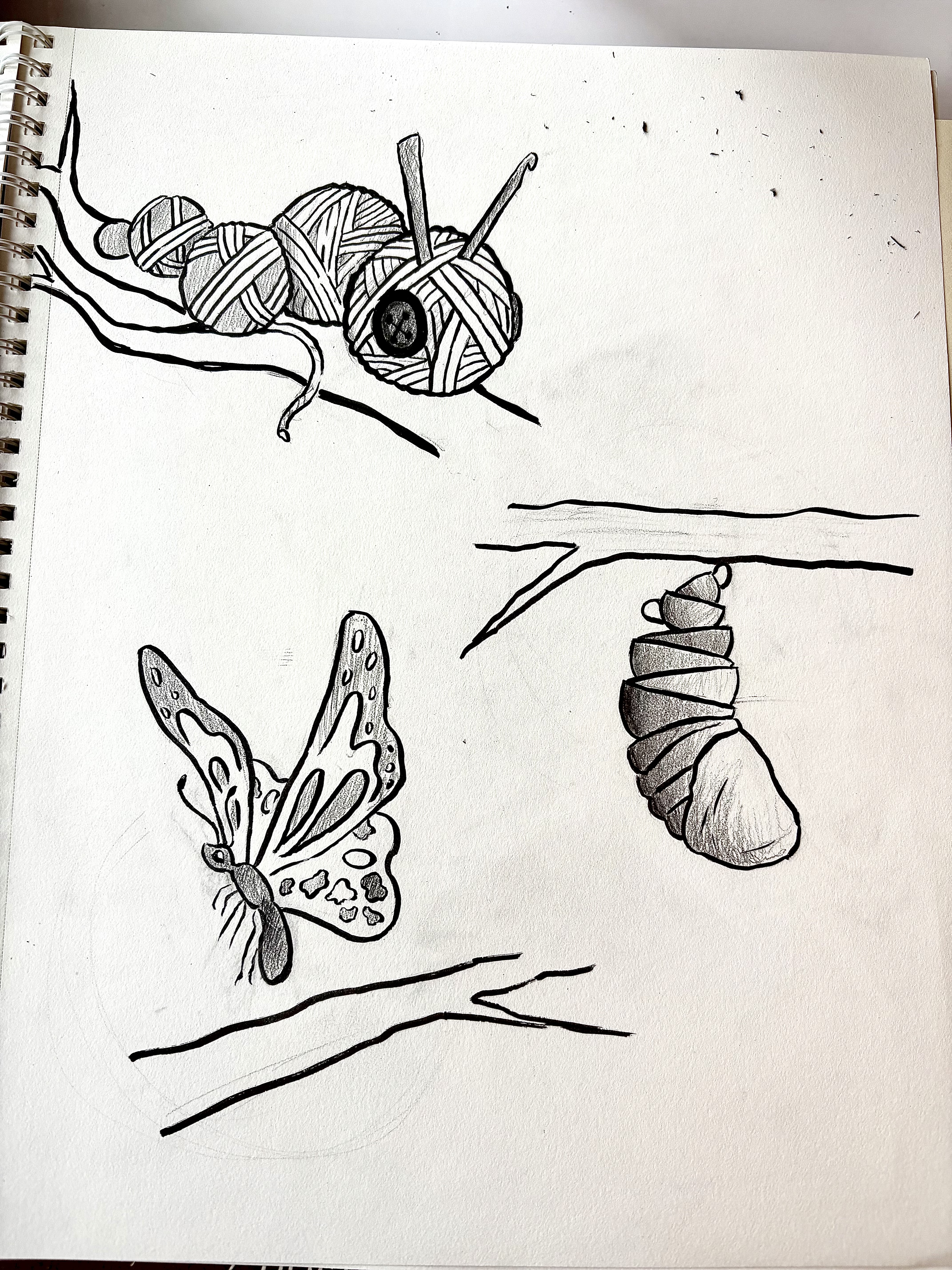 Here’s a 2D work I made for Conceptual Design class… it’s been a bit since I’ve shared anything 2 dimensional here! The official project was to unify two objects to create a third meaning. I wanted to make something useful for the project, so I decided to make logos for each major medium I work with. I already had the caterpillar concept in rough form, so I finalized it. I figured, since he’s a caterpillar, why don’t I try to make the other two a chrysalis and a butterfly? I am happy with them, but the butterfly and chrysalis were a bit less developed, so it was a lot harder to identify what they represent. The chrysalis is a stack of bowls and cups, and the butterfly’s bottom wing is an artist’s palette. I think I would keep the logos black and white, or basically colored, and then color the parts with the medium. Color can hide mistakes in logo design… but I do think the logos are fun sooooo…