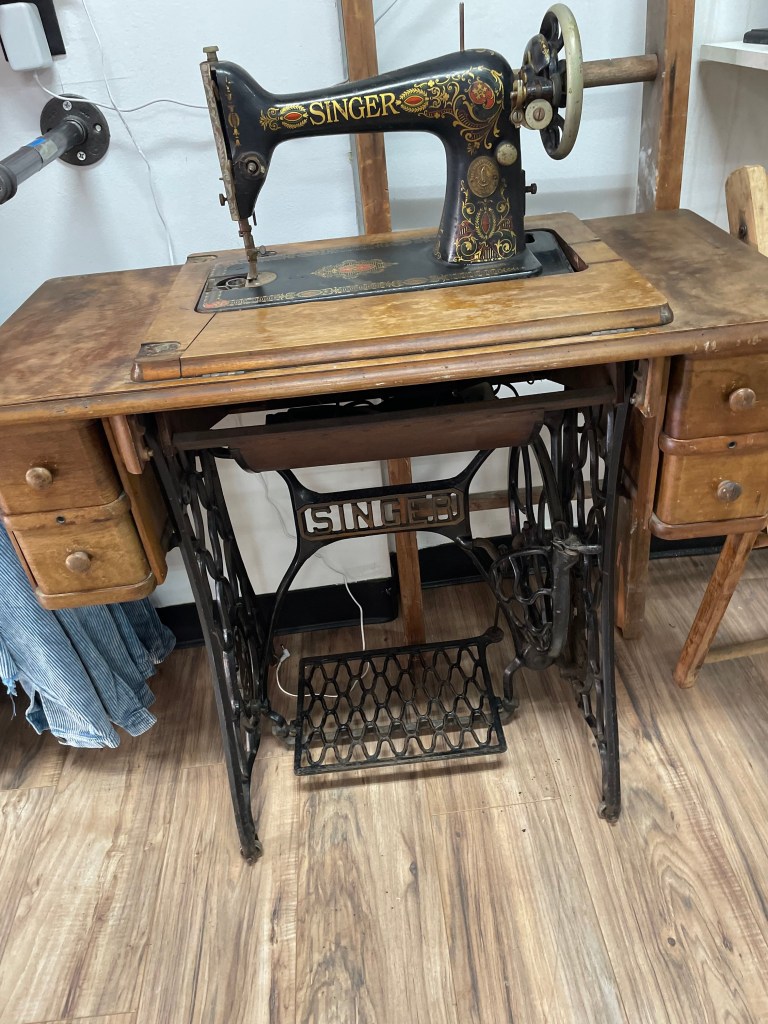 This week, in an incredible stroke of luck, my boss managed to find an absolute gem from history as a store down the street was being cleaned out. Those from this area may remember the bridal dress shop Sullum’s of Olyphant, which had been in business since 1920 until it closed in 2016 leaving a ton of history and old dresses behind. A recent purchase of the building left a lot to be moved out, giving my workplace the chance to house this absolutely beautiful antique Singer sewing table.