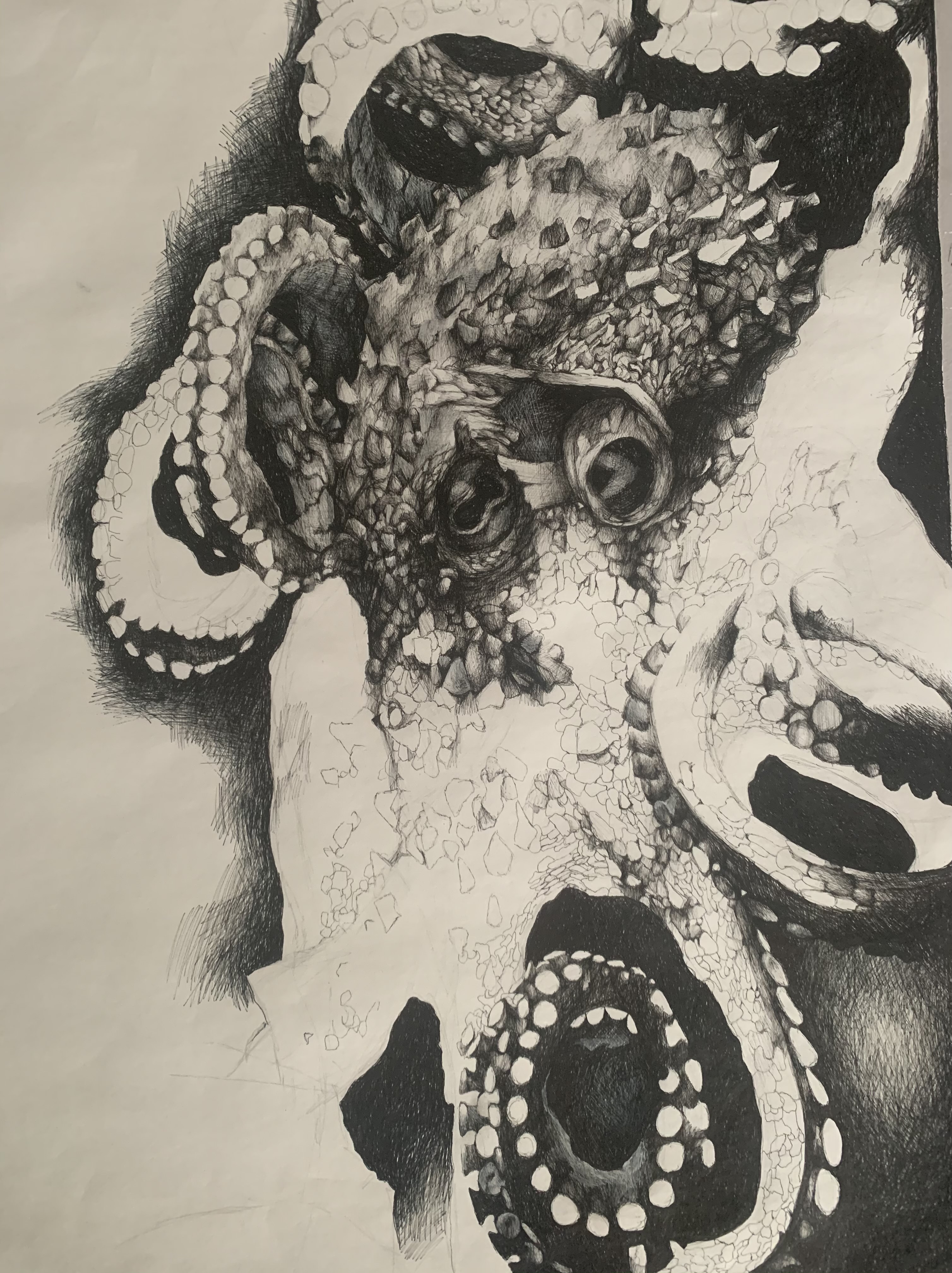 While working on the piece though, the adjustments I made were found in the lower tentacle, a bit in the background and the left section of the octopus where enhancements in value are prominent, development of form, and some implementation of intense highlights (a special thanks to white POSCA paint markers and Gelly Roll pens for that, they really are a life saver) can be seen. The detail work with such an inconsistent medium makes it difficult to make any strong advancements in a short period of time, and my hopes are to finish the work by late next week if I can find the time.