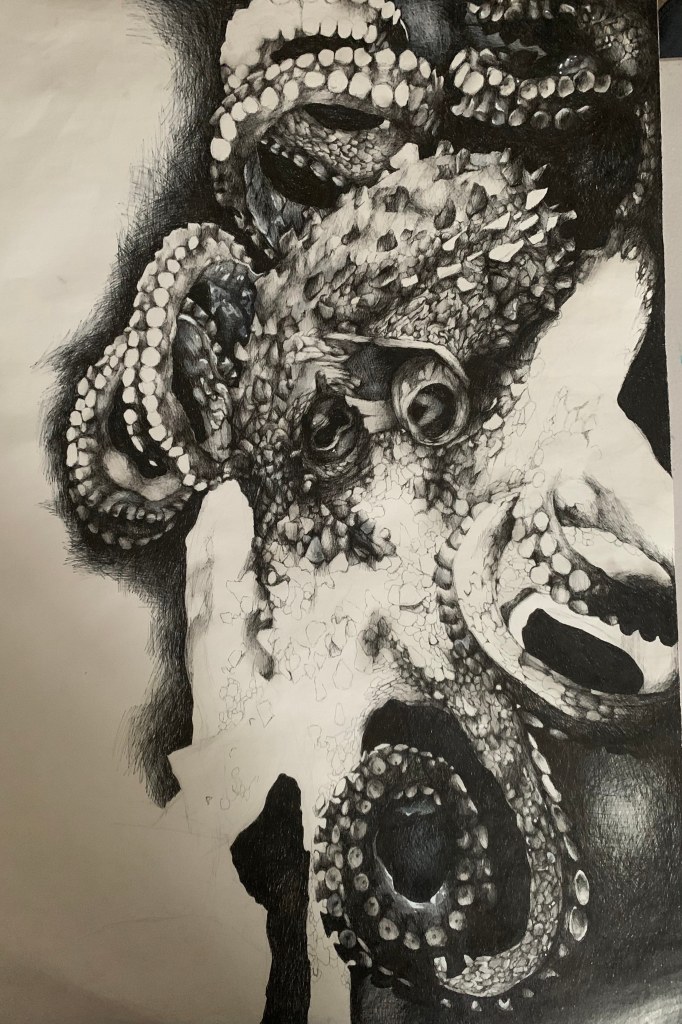 With that being said, the work itself is slowly but surely nearing to an end, as a lot of elements have been addressed, and the form is starting to become more discernible. The only thing that is hindering me from completing it sooner is the amount of fine detail that goes into the body itself, and how each scale-like part of the octopus’s skin requires quite a bit of concentration and individual attention.
