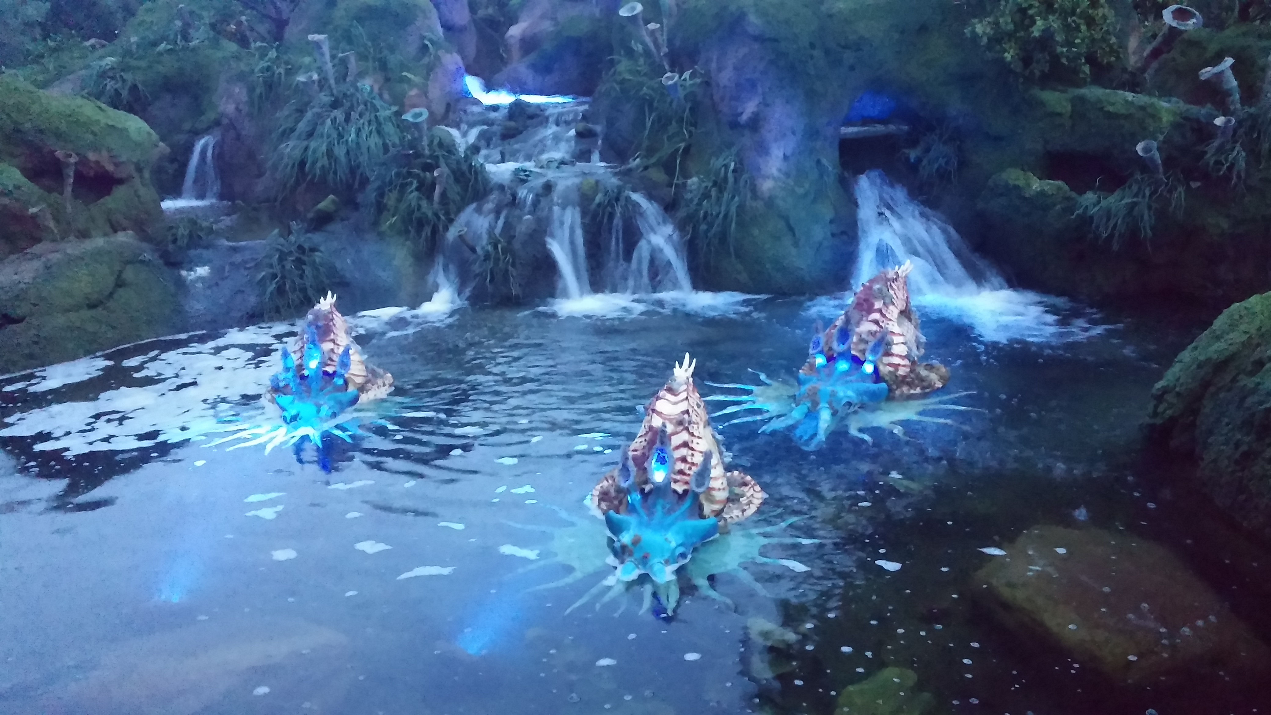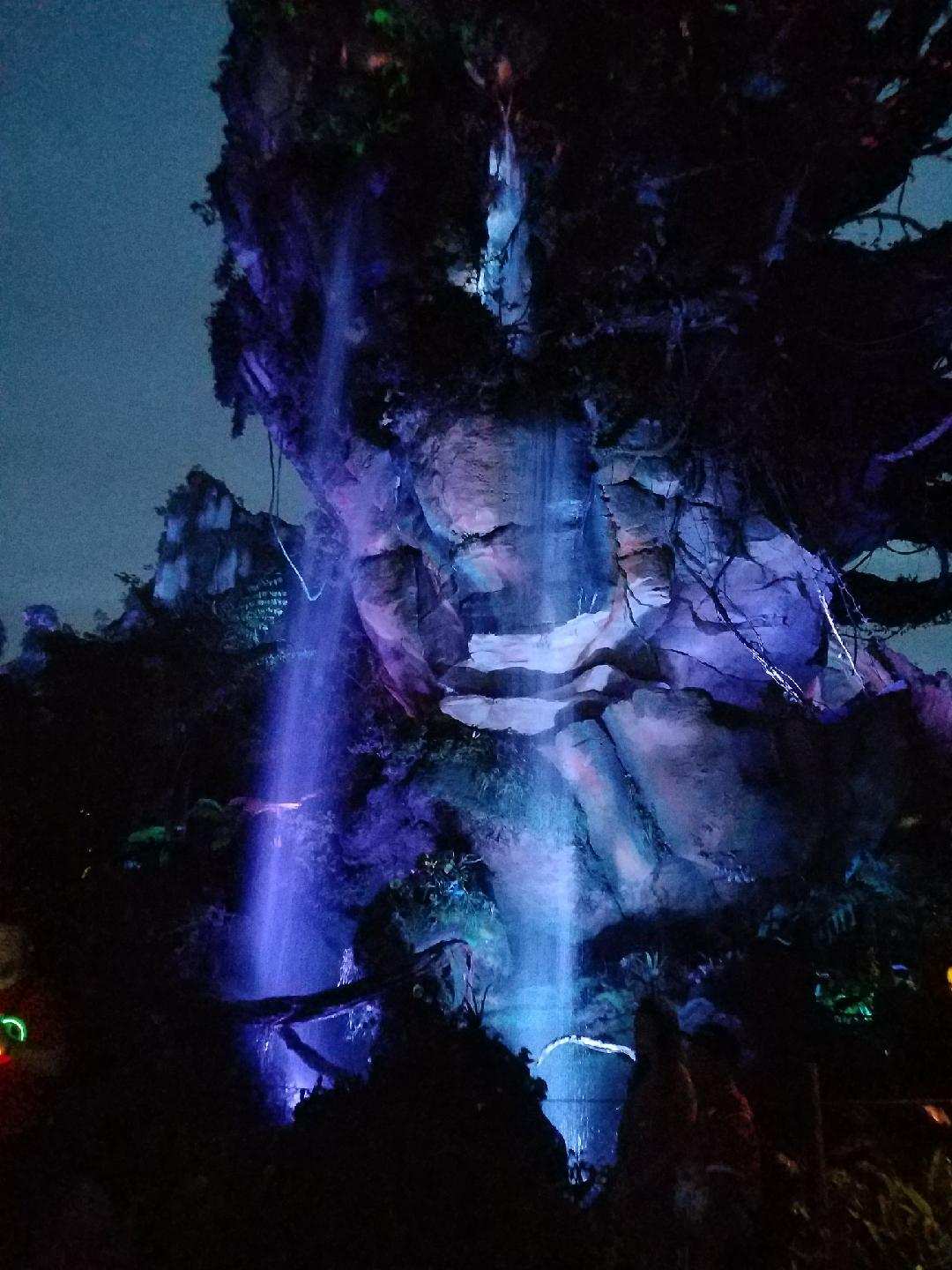 The first thing you notice and one of the coolest aspects of this new side to Animal Kingdom, was the giant floating rocks that are suspended high in the air, just like in Avatar. As you start walk around you are surrounded by exotic looking plants real and created, matching the environment you might walk around on the planet Pandora. The structures were also hand built with each small detail needing to be handmade by the Imagineers. They have creatures that you mind find as well that shoot out water from their backs within ponds around the area. If you stick around towards the end of the night the whole place starts to glow with certain fauna glowing green, purple, and blue. The ground also glows with greens to light up the pathways.