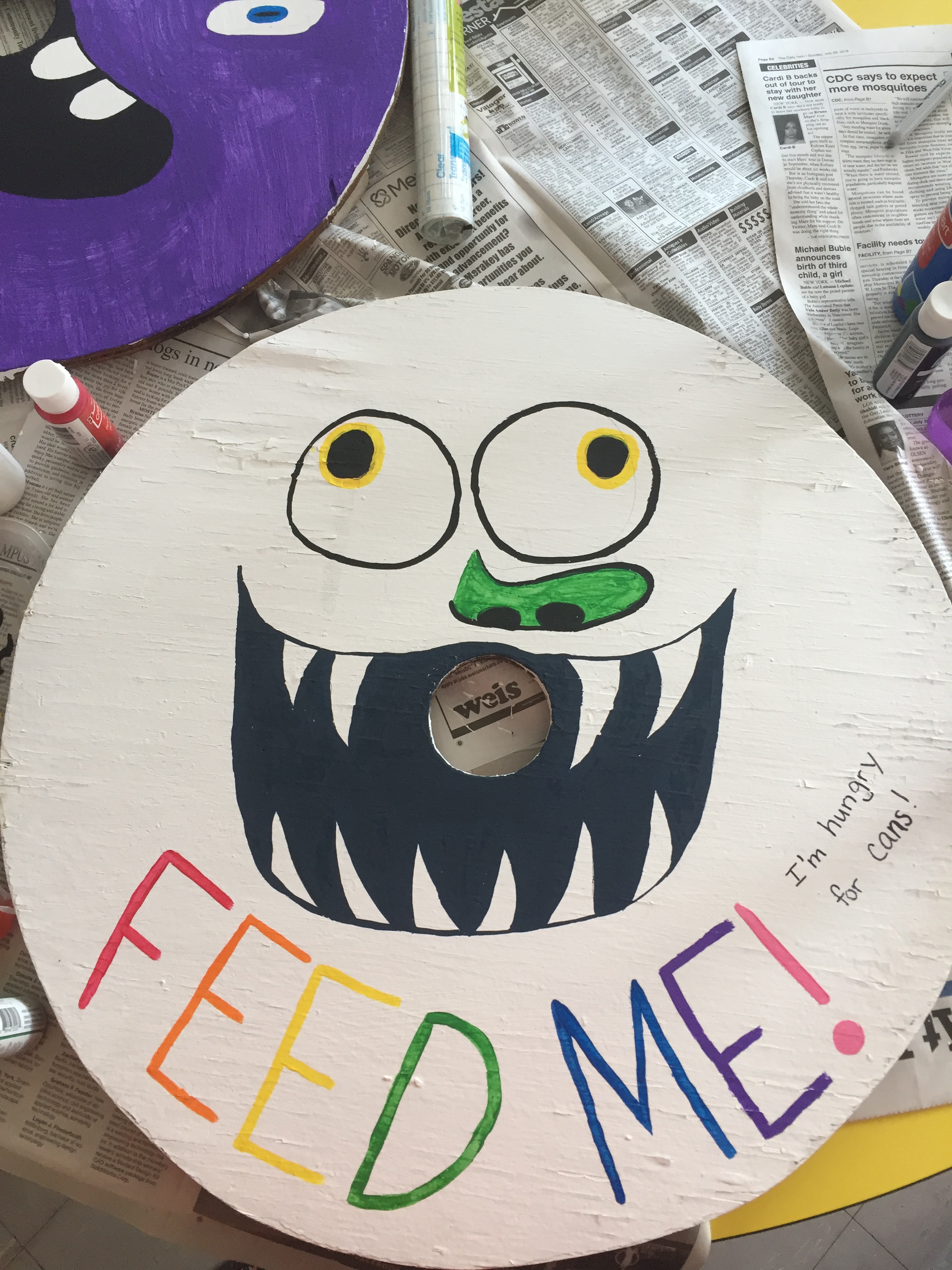 We wanted to make recycling more fun! So I painted hungry little monsters onto the lids of the cans.