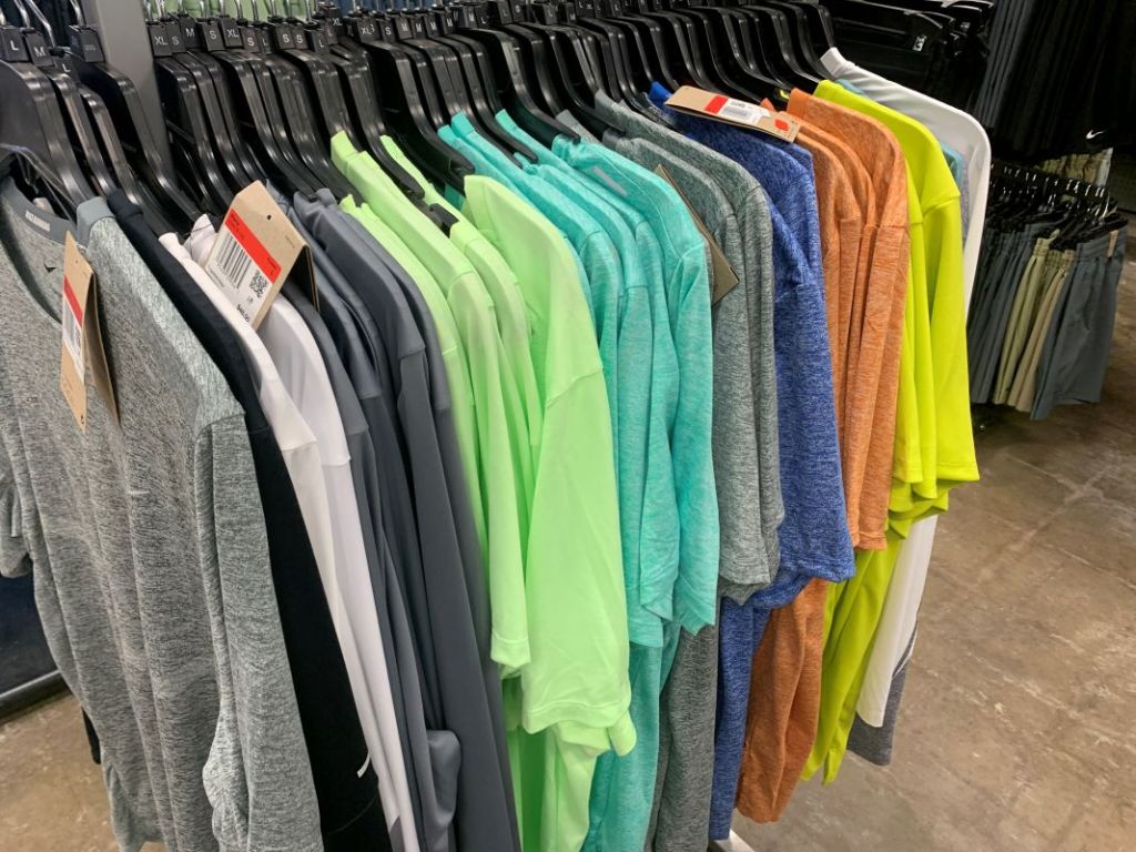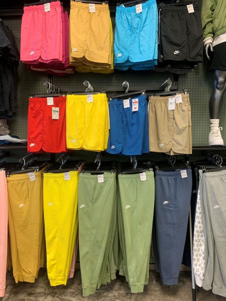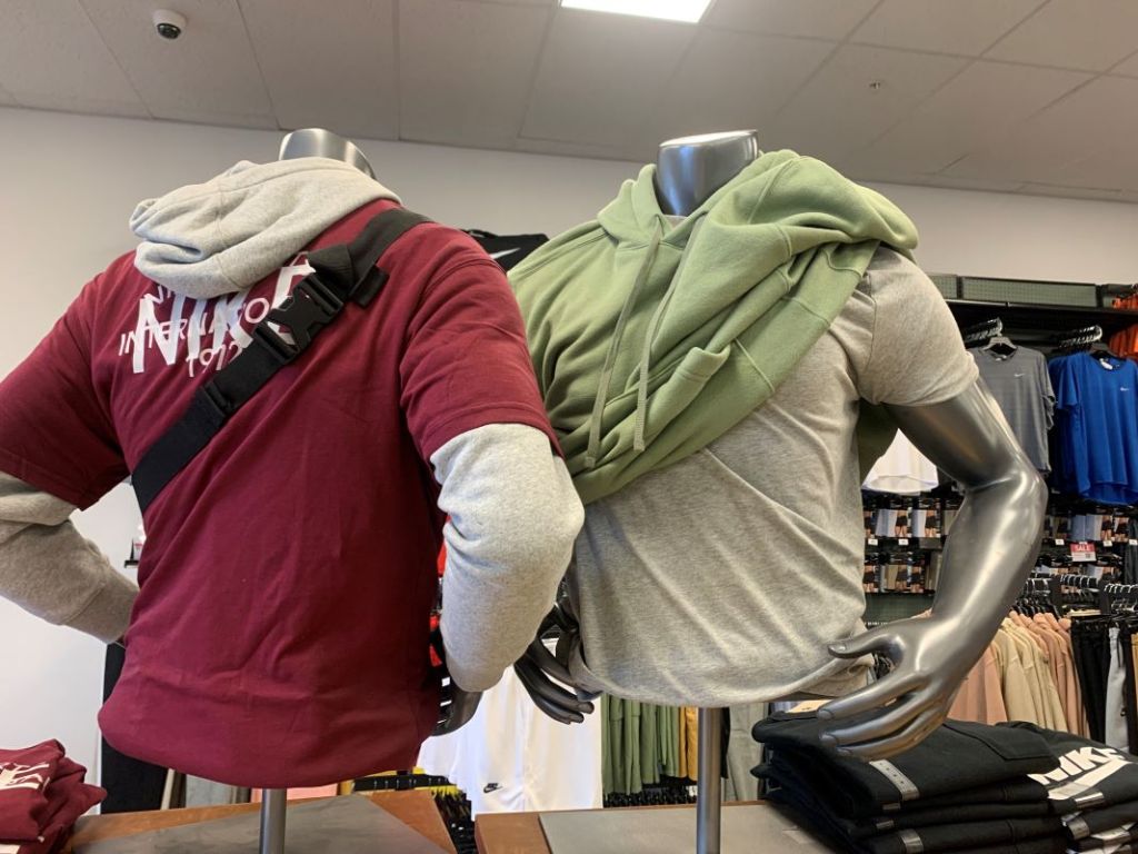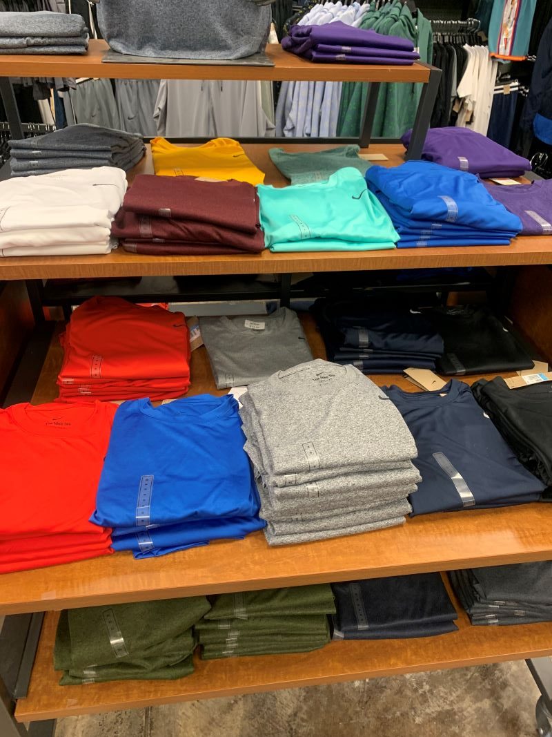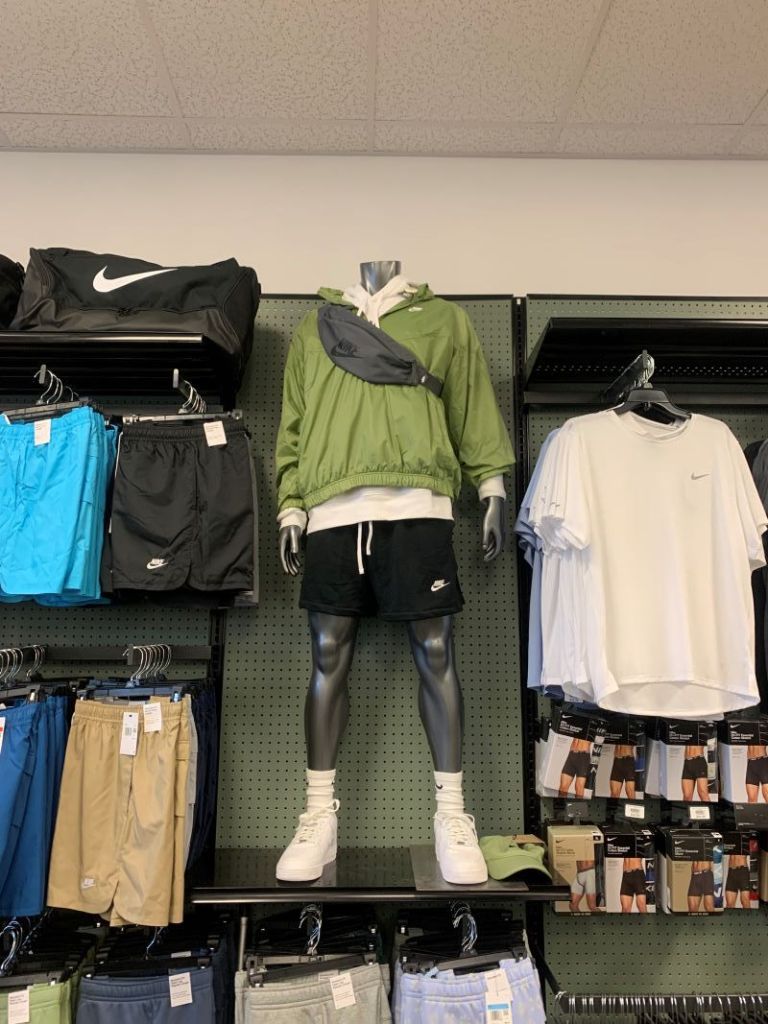 There are other instances where say if there is a customer interested in buying a dark blue pair of sweatpants and they want to match it with a shirt, as an apparel associate, I will help them figure out what would fit best and this is where my color matching skill comes into play. I will choose the best matching options based on color and tone. So for a dark blue I might pick a lighter blue or a light gray option. This becomes really helpful to elderly customers because they usually have a harder time determining tones and colors or clothing. A design aspect that I have found while working in retail is the use of designing clothing on mannequins. This becomes important because, when done correctly, the design of the clothing not only is a good art style but it also helps the company sell more merchandise. For example, this one mannequin (above to the right) has a t-shirt and a sweatshirt on it. The sweatshirt is designed to sit halfway on the torso to visualize the t-shirt in a way that doesn’t look messy but rather eye-catching. Its design aspect draws in the customer.