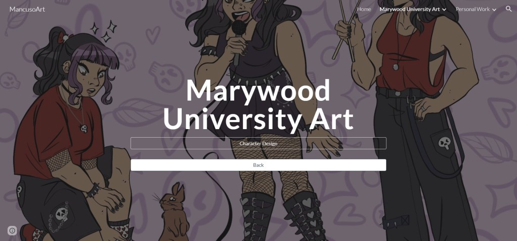 So, I went with Google websites, because it’s free and easy. What would you know? I had fun making the website! It was nowhere near what coding actually is, but being behind the scenes and making functional ‘back’ buttons for my website reminded me of my high school coding class, which I loved! It was really easy to design the website how I wanted- the options were limited, sure, but I didn’t really care because I didn’t need it to be this perfectly unique thing. It displays my art, and it looks nice- that’s all that matters to me. Here is a screenshot of my website, and the ‘back’ button I’m so proud of. Feel free to not visit the website, because while I should be self-promoting, I’m not (also, there is an obvious lack of the link for said website). I just want to express my personal journey of trying new things, which in this instance, is something probably every artist my age has done by now.