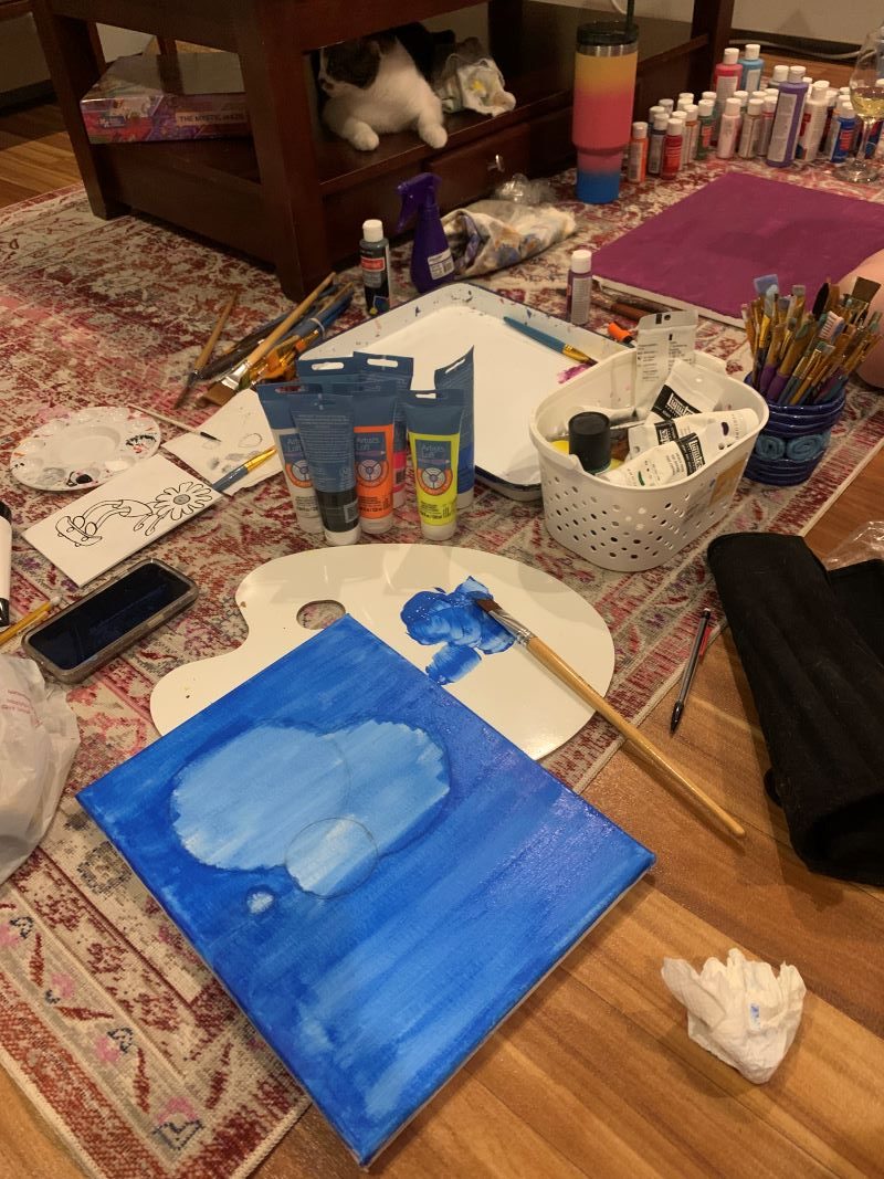 For me, I wanted to create something different from the last time I painted. By accomplishing this goal, I started with a cool color palette and added circles. I chose to create something pretty simple with just the circles. I added just enough so they wouldn’t bombard the painting with too many while also not being too little of an amount either. It may be a simple painting but the process of it while enjoying time with friends helped decompress all of the stress that life had been giving me. If this sounds like something you or someone you know would enjoy, I highly recommend.