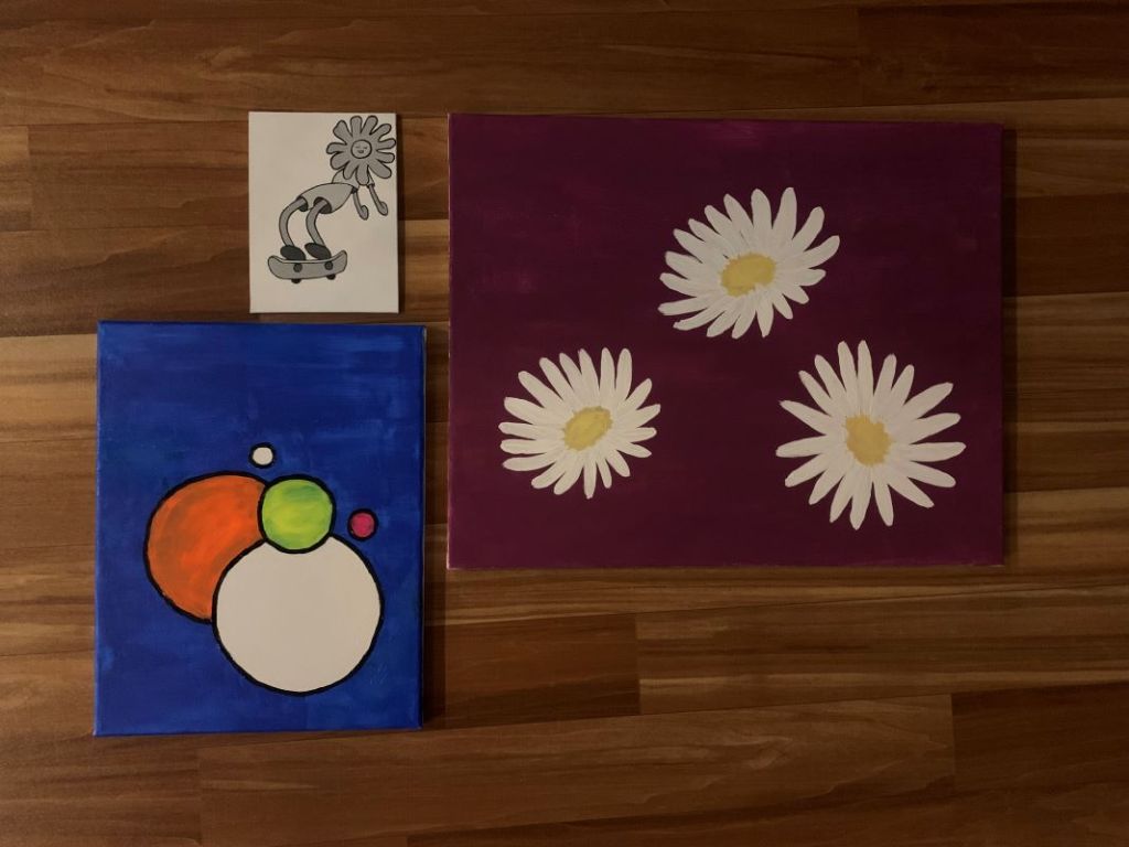 Once we got all of our materials ready and the Netflix show playing, we started painting. My one friend painted a simple cartoon character on a small canvas and my other friends painted a few daisies. Both show the different styles between my two friends which is interesting to me because I love to see each personality and artistic style show through their artworks.