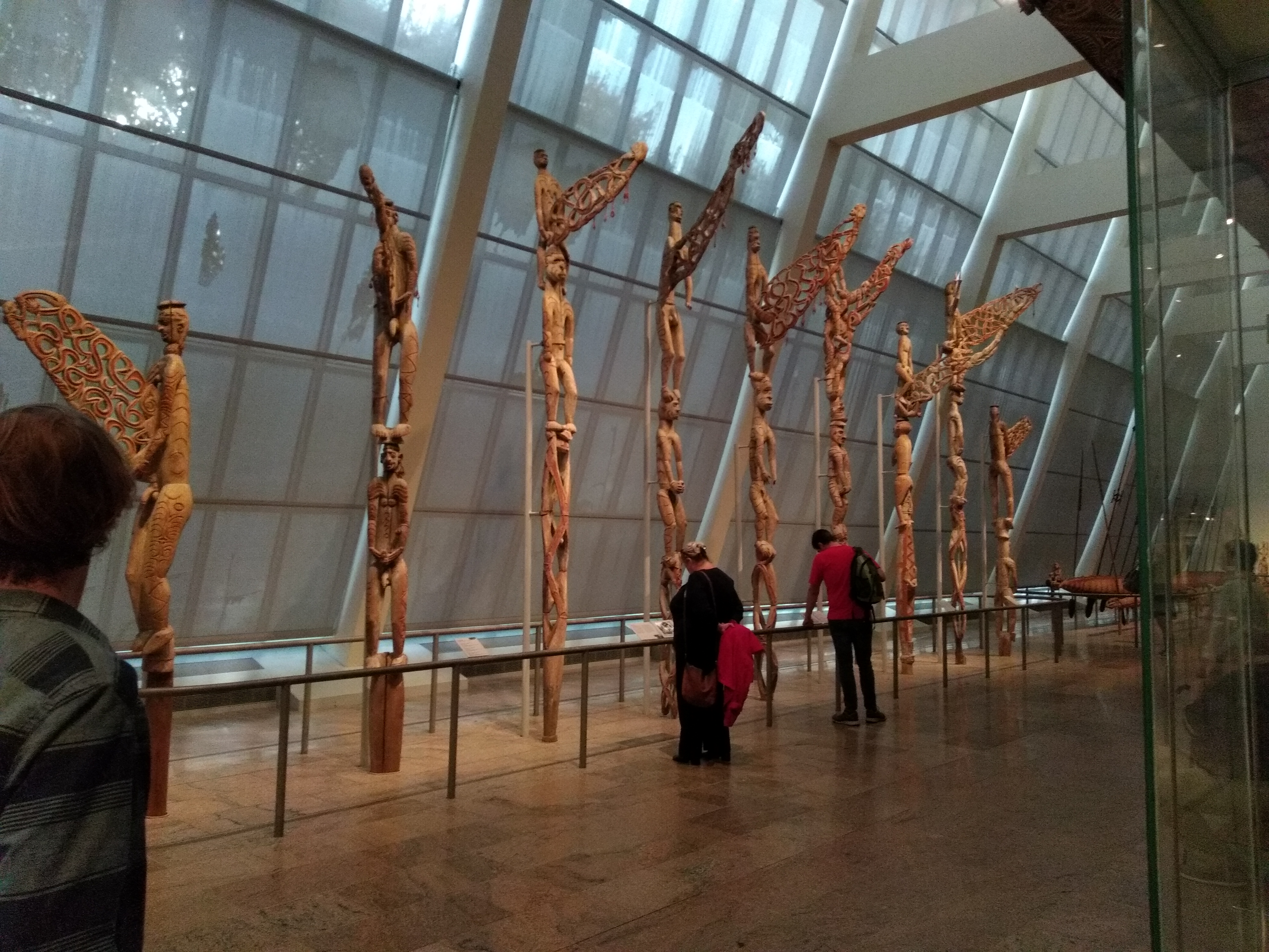 My absolute favorite were the Asmat Bis Poles. These huge Poles, carved from trees, are used for memorial feasts to celebrate those who have passed away and became ancestors. In this celebration though, it remains necessary for the living to realize they must avenge the dead since Asmat cosmetology states that death was caused by an enemy, either through war or magic, and each death needed to therefore be avenged. What I found most astounding was that the Poles were carved from trees turned upside down and that the ‘wings’ protruding from some figures were actually carved from the trees’ roots.