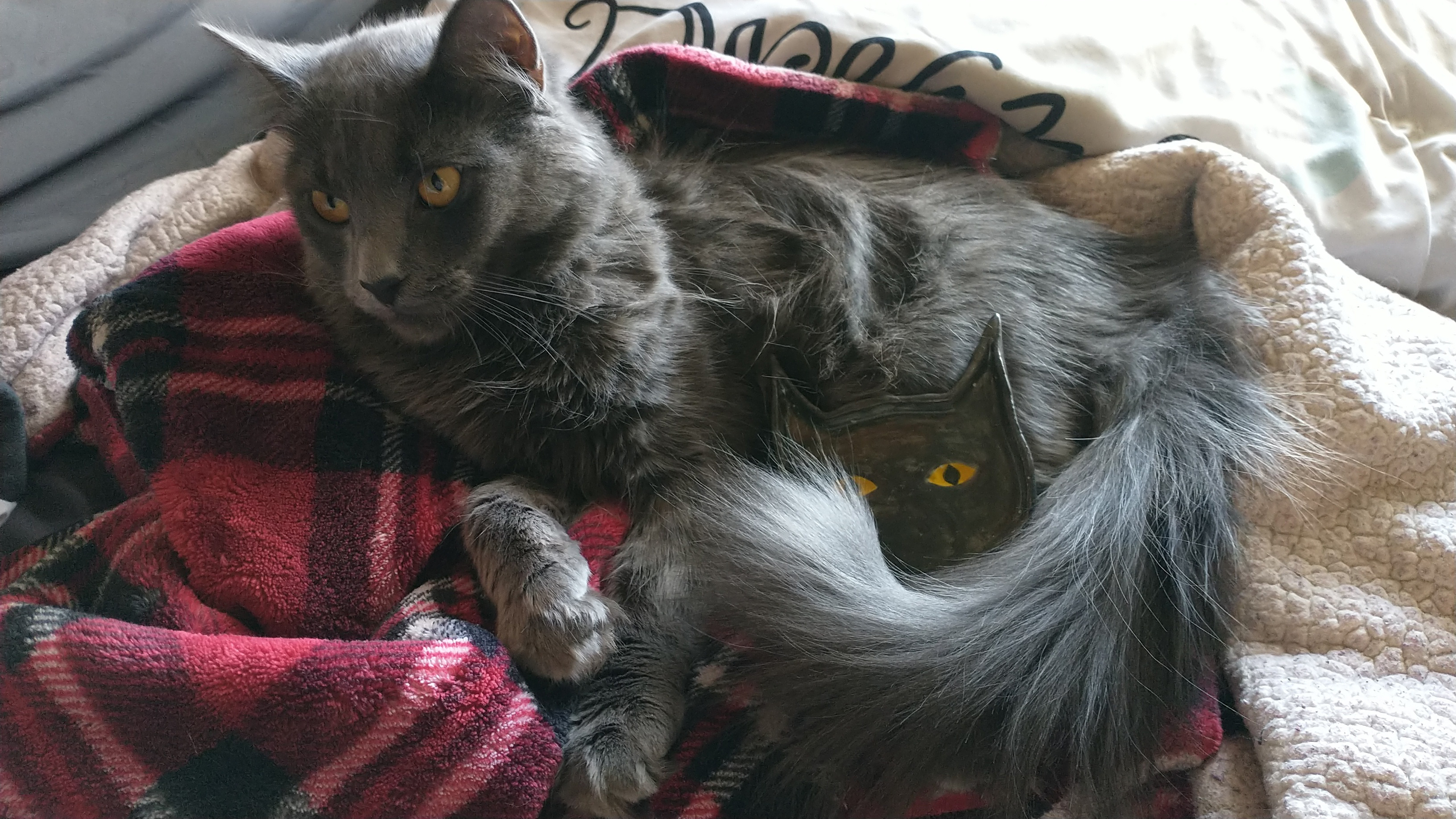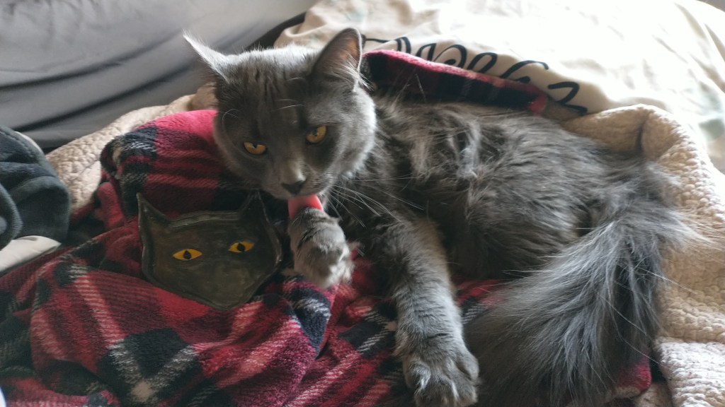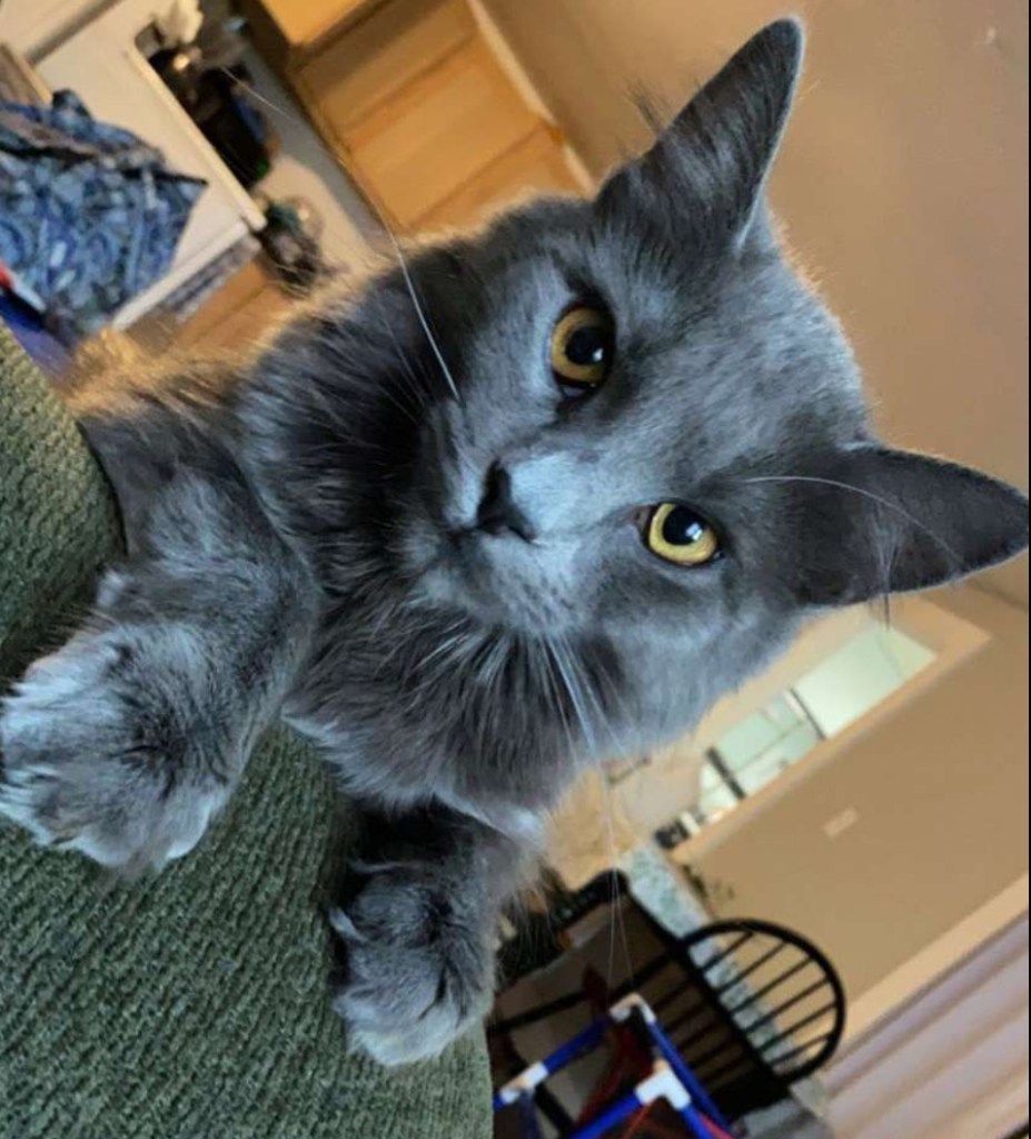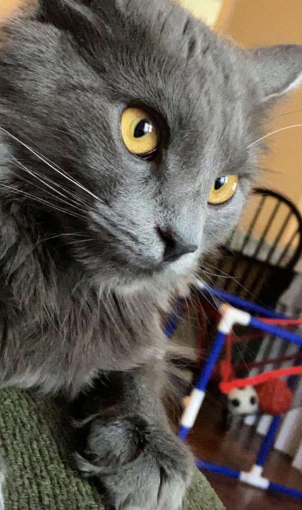 She is a gorgeous gray longhair with these piercing yellow eyes. Her name comes from my favorite show, Supernatural, where the first main enemy is who we are introduced as “Yellow Eyes,” the yellow-eyed demon. We later find out his name is Azazel, and I thought the name was perfect for her. (Subsequently from Jack, my bird which I wrote about, who is named after a Nephilim in the show, a cross between an angel and a human with yellow-eyes who becomes the strongest character in the show.)