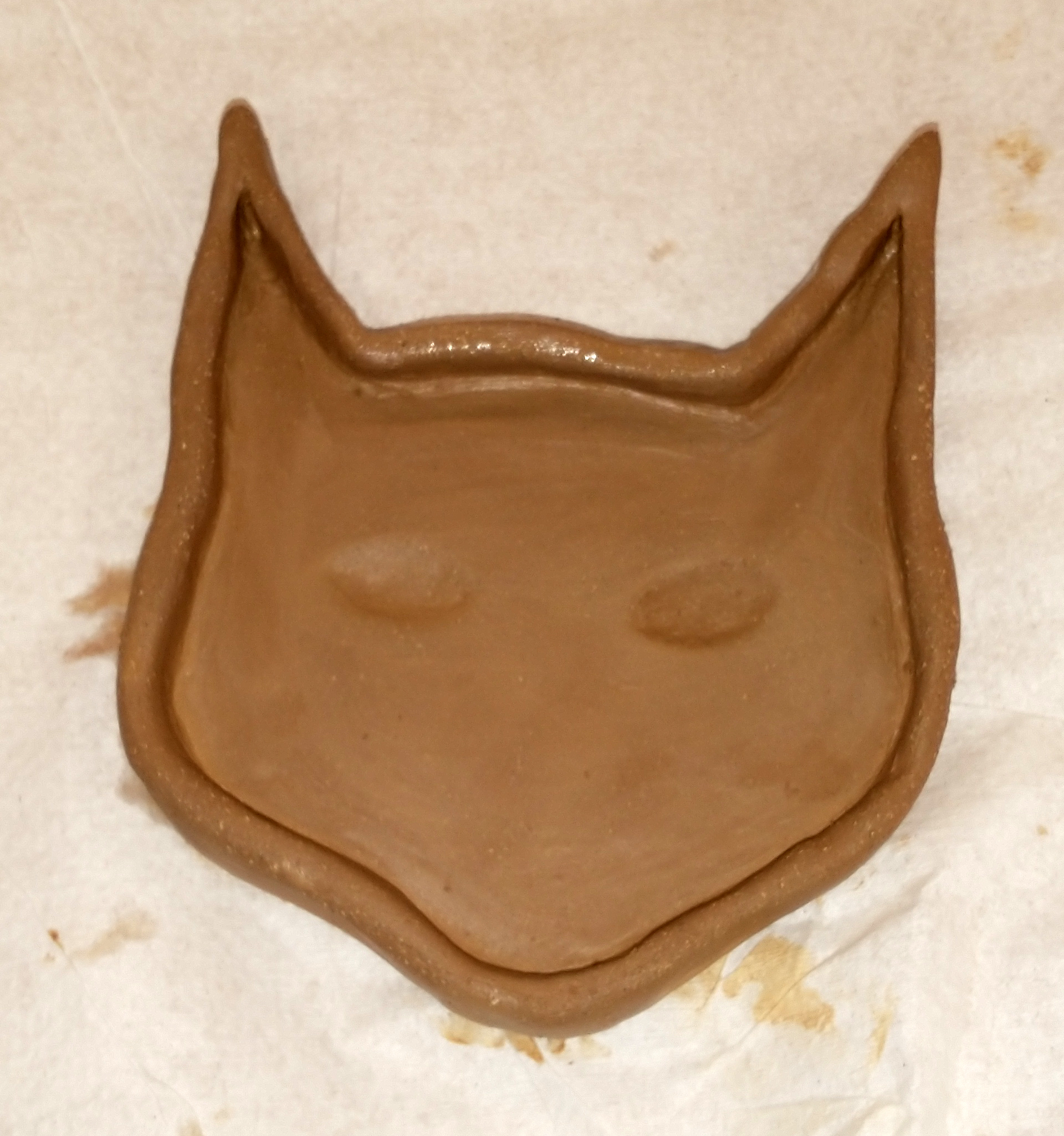 I started with making a flat slab and cut out the shape of a cat head to make the bottom. From there, I made strips of clay to wrap around the sides in order to make the walls of the dish, making sure I properly adhere them together. I smooth everything out and then go about the eyes. All I wanted to be depicted was her eyes and to leave out all the other details. So, I made small, sharp, almond indents for her peepers.