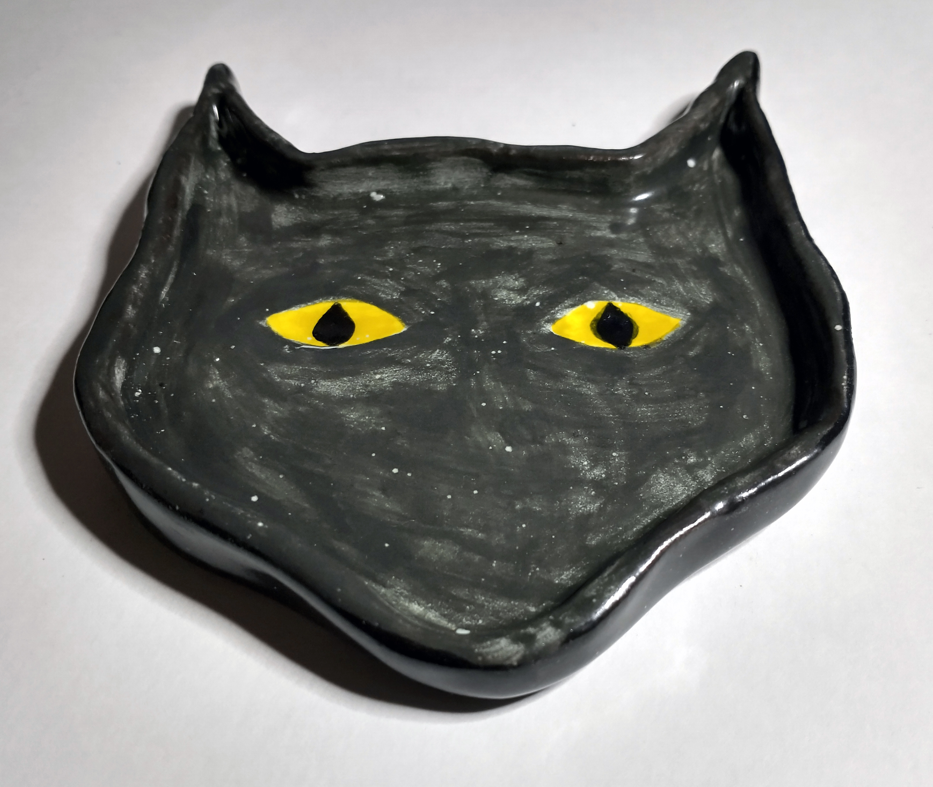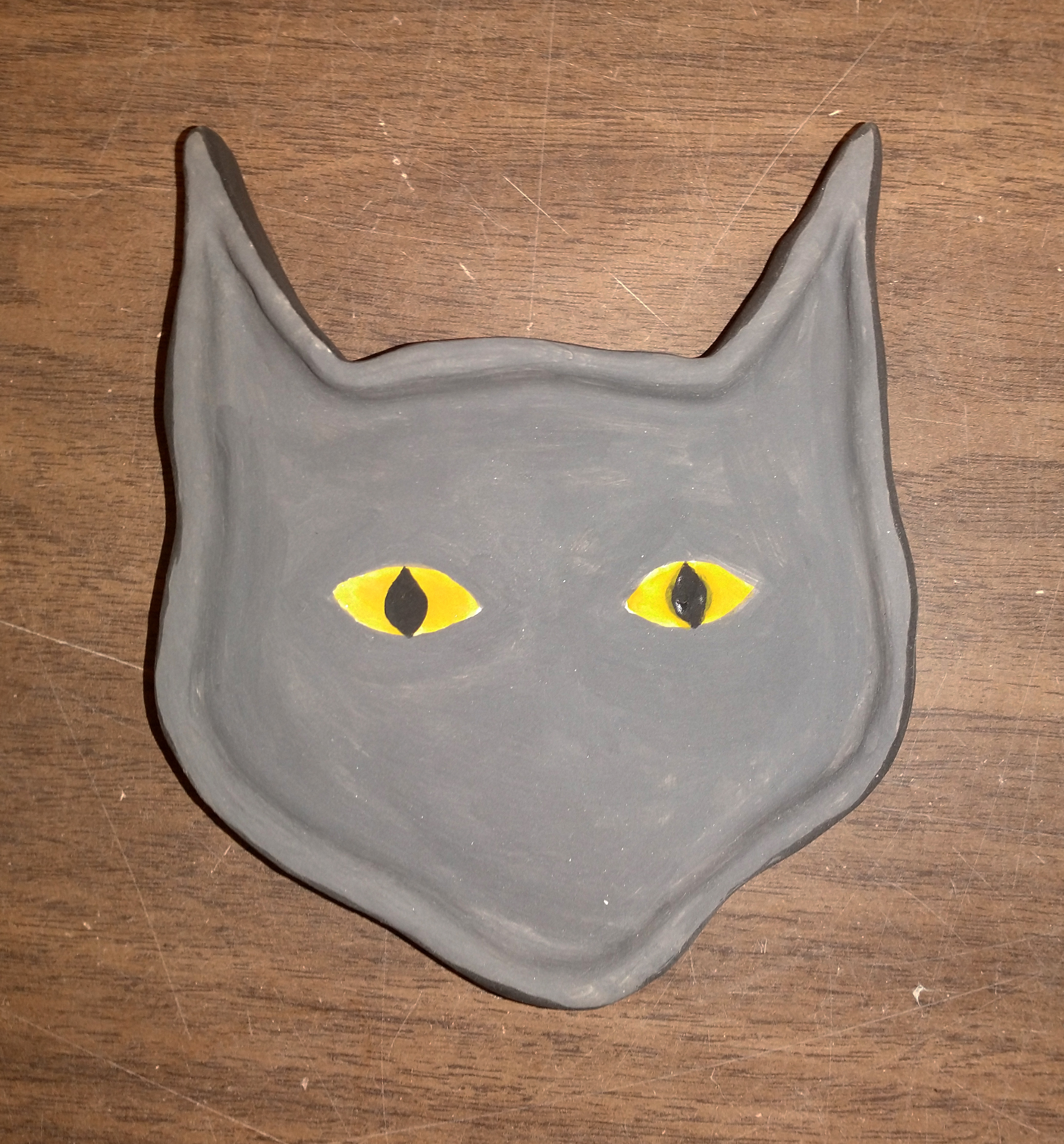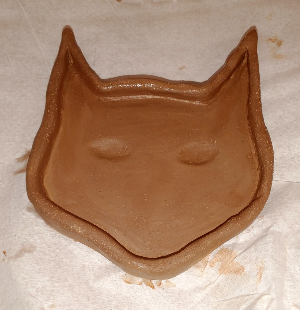 Anywho, when going about making the dish, I wanted to keep in mind her yellow-eyes and the shape of her cat head as well as making sure the sides of the dish were not too tall. I don’t have many progress pictures, but I promise to be descriptive.