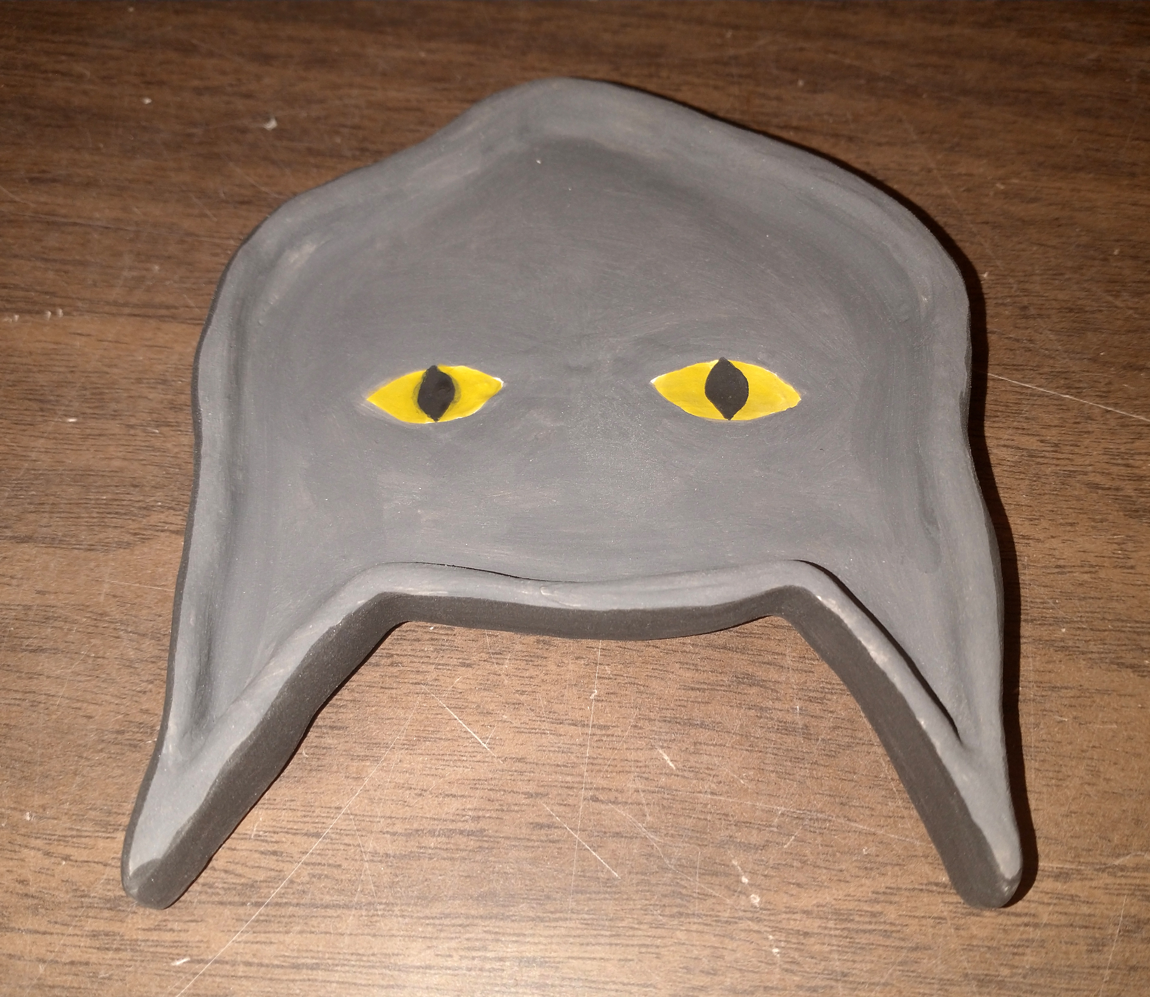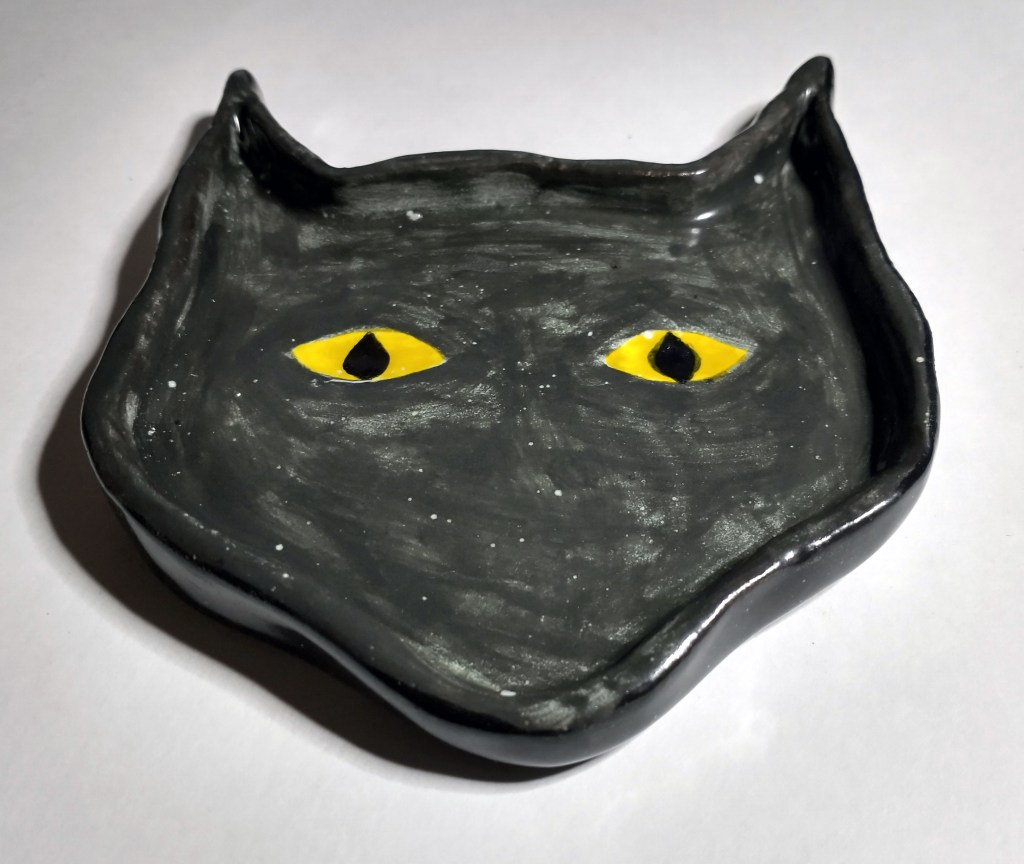 Following my previous post, which can be found here, I have also made a ceramic dish for my cat. It just so happens to also look like my cat, sorta. When we first got her, Azazel, we knew she loved wet food, but the current dish we had was too deep for her whiskers. So, I took it upon myself to make her her very own wet food dish. For reference, here’s the beast.