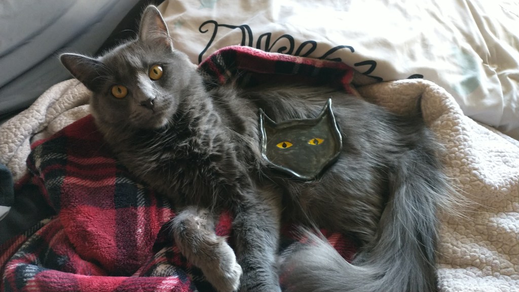 Here I have her posing with it and she isn’t that interested. We ultimately realized that it wasn’t going to work the way I’d hoped. The edges are too low, so when she’s licking at it, a lot of food gets pushed off. It also doesn’t hold a lot, especially when we use big cans of food to feed her. So, I supposed I would also change that. It still works nicely as a dish, just probably not for food.