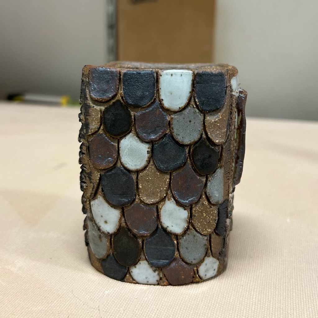 I took my time on this project figuring out what glazes I wanted to use. For me, this last step is the most intimidating part because you can work so hard and put a lot of time into a project just for the glaze to come out in a way that you didn’t expect. To try and prevent that from happening I made test tiles tried out the ideas I had on the small pieces of clay and fired them to see how they would come out. It added some significant waiting time to the process but I am so glad that I did this step. In image 1 I tested out how the door would look with raw clay and iron oxide. Image 2 was a test with 3 glazes: Waxy Black, San Miguel, and Leach White along with black underglaze, iron oxide and raw clay, this was how I ended up glazing the roof. It was very time consuming but hopefully worth it in the end. Image 3 was to test the siding on the hut, I used black underglaze with some wiped off.