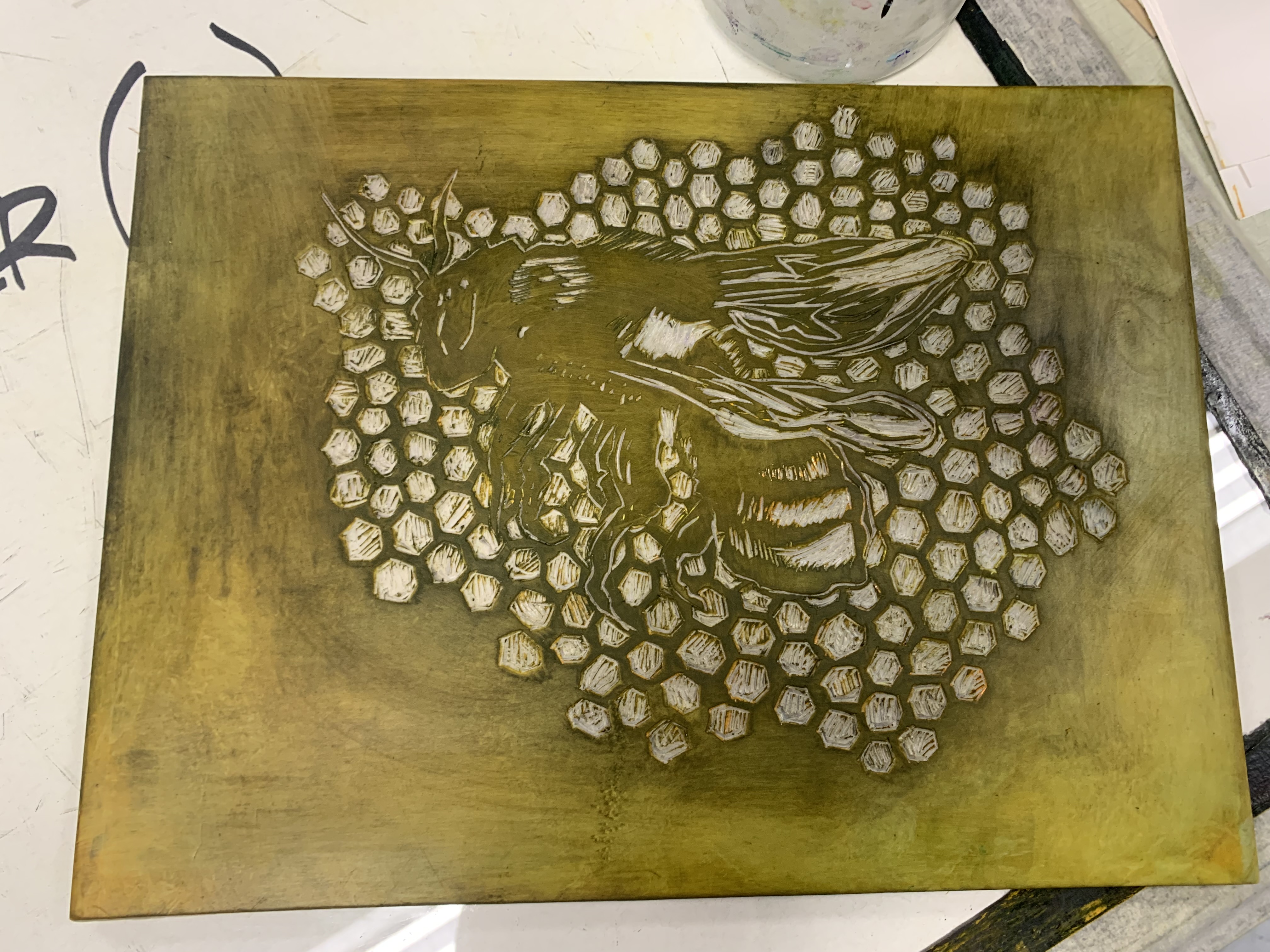 I chose to use one of my old linocuts I created in highschool, and do a little revamping, and experimenting before the honey bee harvest festival, to showcase, and sell some linocut prints! When I created this linocut I wanted to make some sort of animal or insect. When choosing a bee I took into consideration the honeycomb pattern for extra texture and creativity.
