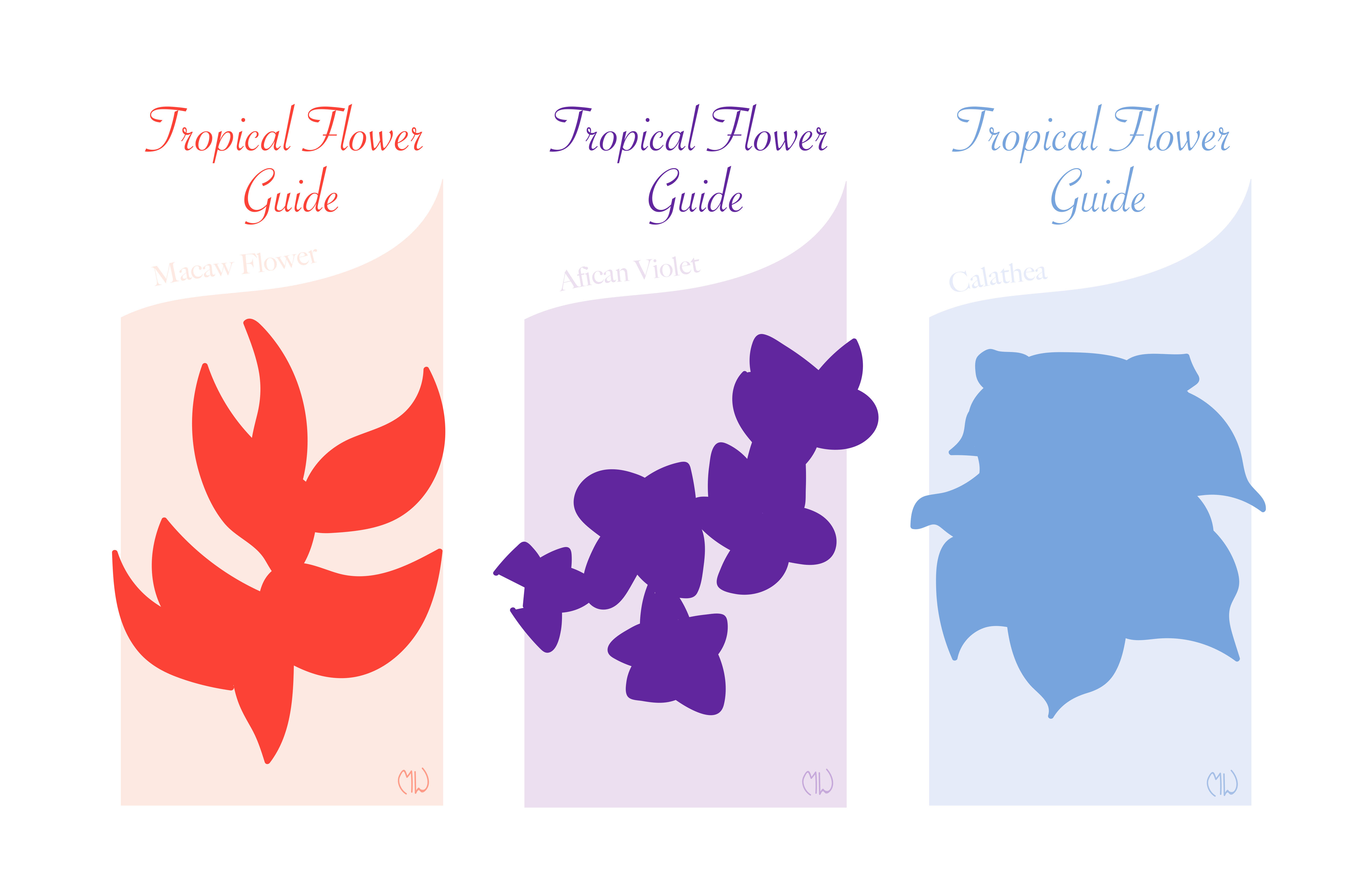 For my own project I created a list of many possible themes and ultimately went with “Tropical Flower Guide.” Next I picked out a color palette for the entire brochure set while trying to match the color of the flowers. Then I began making rough drafts of different tropical flowers while using the monochrome color scheme. After a few revisions I created my final piece. I tried to change the weight of the background and make the artwork be the main focus. I also tried to make the type more prominent because it was also part of the main focus. Both of these parts needed to be balanced with each other. Finally I changed the last pink flower and I tried to make it so that it could stand out if it were by itself, also changing the rest to make them all consistently designed. Overall this was a tough project but it taught a lot about balance, unity and harmony, and how to combine the use of type and imagery.