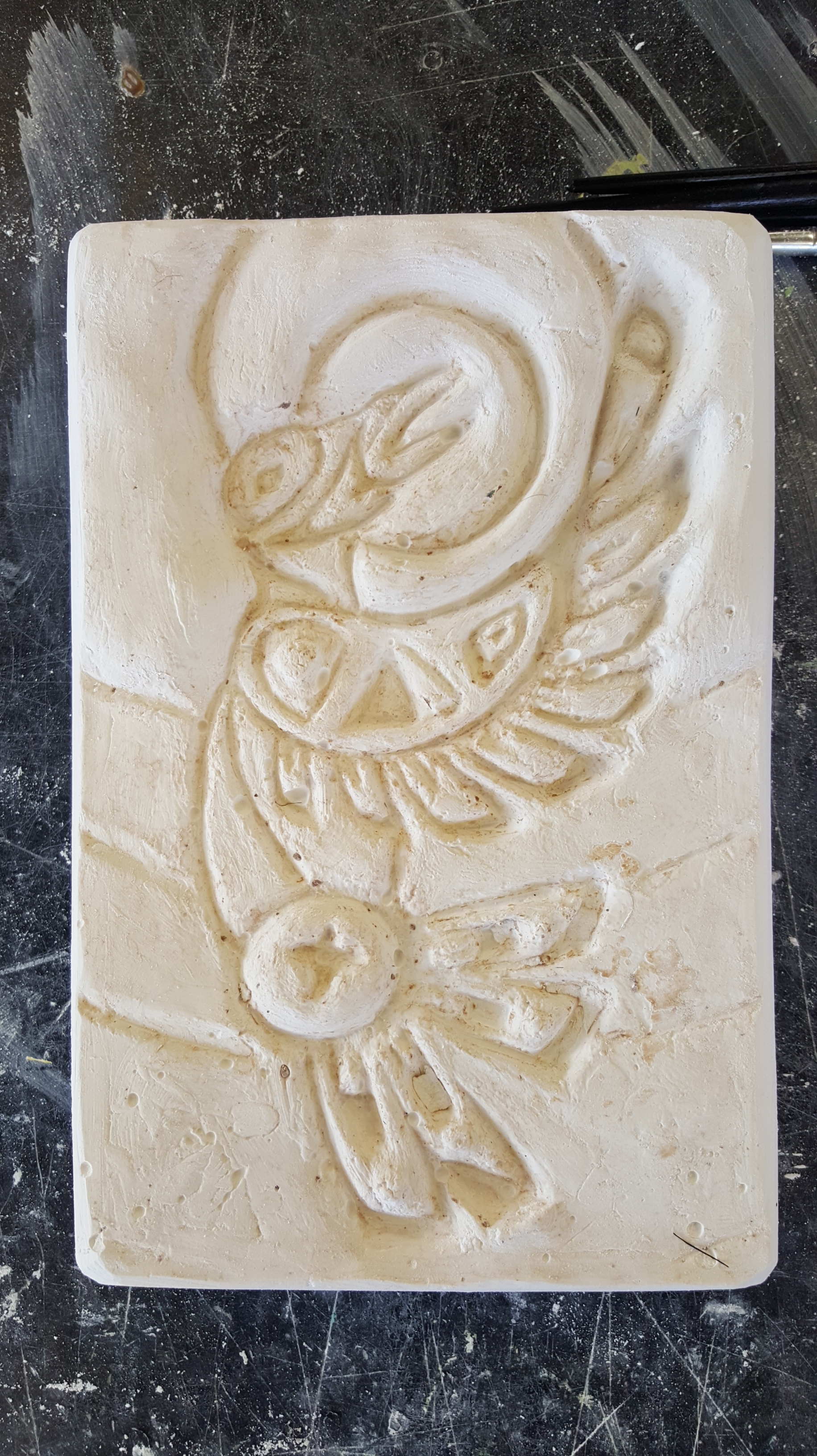 In class we discussed the possibility of treating the surface so it would have the a crude likeness to a true bronze cast, and after seeing some of my classmates successfully treat their surfaces this way, I was convinced. We started with a flat coat of black covering the entire relief, and after it dried began to dry brush shades of dark green onto the new black surface. Gradually, the dark greens turned to lighter greens, which turned to yellows and finally whites. The application of the acrylic was time-consuming, but the process of feathering it onto the surface with a dry brush was very repetitive and strangely soothing. I quite enjoyed it, and the results that ensued: