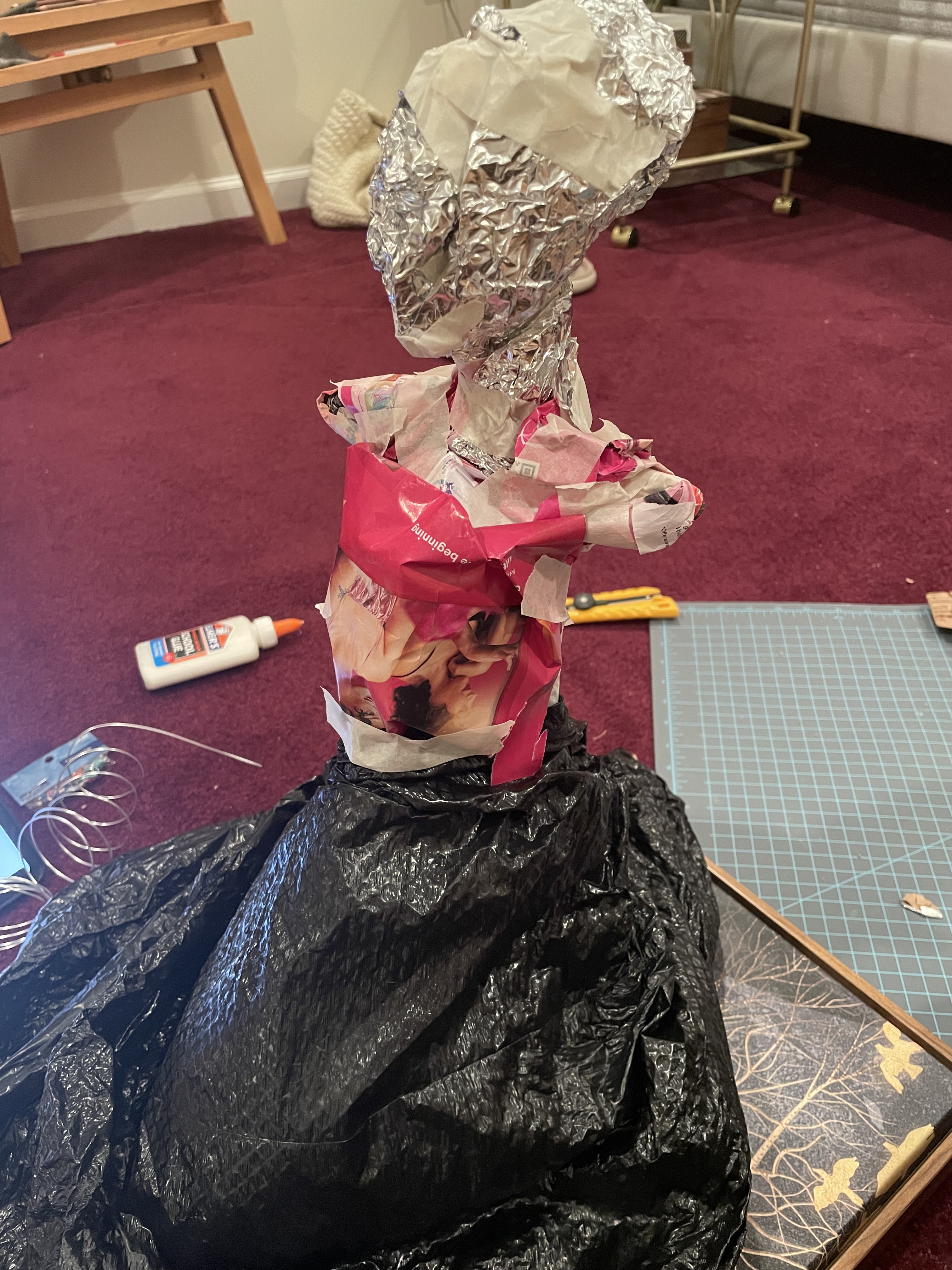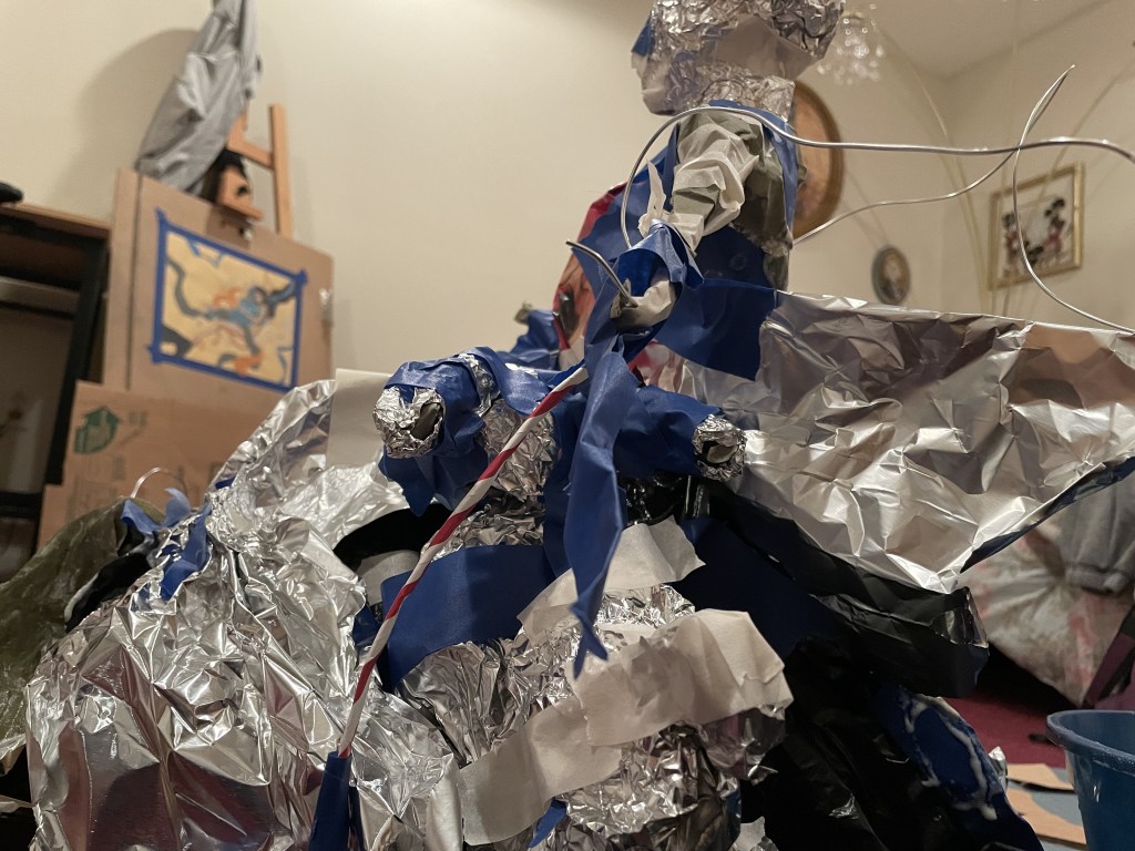 I couldn’t find a cluck of marble to carve in, so I settled with paper and other little trash I had lying around instead. Literally, I used (clean)trash bags to make the bottom of the figure’s skirt. Perhaps from the chaos of finals, my brain cells decided to give up and not follow my original sketch for the amusement ride. So I just went at it with a questionable cut out from the cardboard and, from there, added and took away papers and foil. I blasted my music and imagined myself to be an inspiring artist like the ones in movies who are so intensely focused on their work. Well, in my case, I did not know what I was doing. Either way, I ended up with a pile of paper, foil, and a trash bag, all mixed up and stuck with tape. At that point, I could start seeing my sculpture coming to plan.