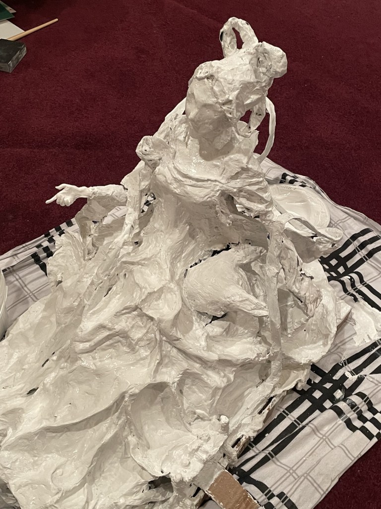 After applying a few layers of gesso, I now stand at the point of painting it all. I must say, I did not expect this to be the part I dreaded- but it just doesn’t feel right to add color to this! I hope this “ugly” phase will soon end, and I can be left with a satisfying sculpture. Wish me luck finishing it soon- by that, I mean in less than 23 hours!