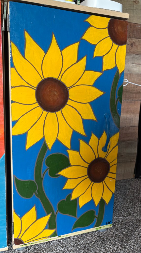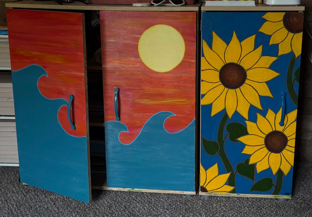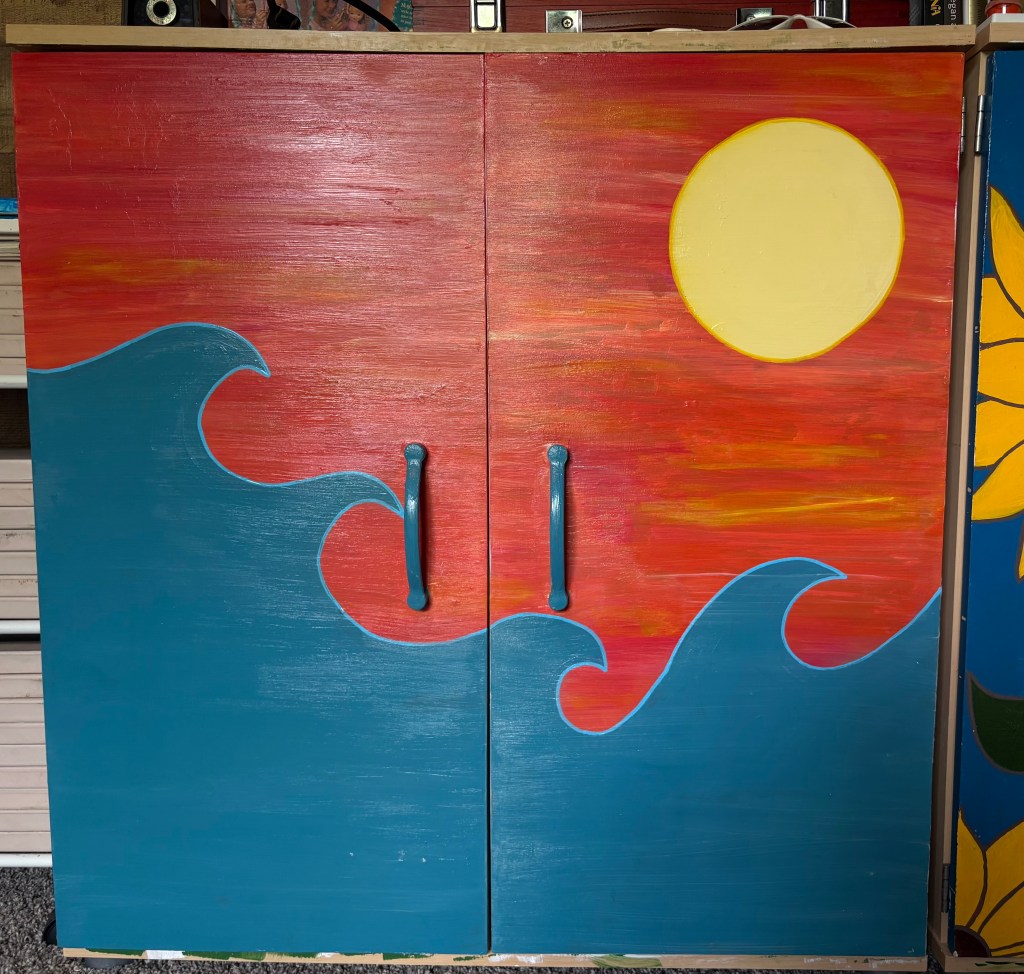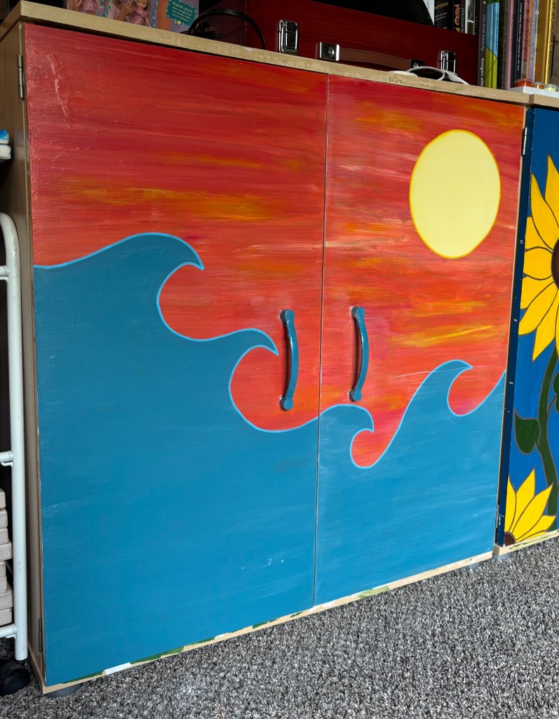 A couple summers ago, I took an old cabinet in my basement and spruced it up a bit by painting a mural on it. I used acrylic paint to create a medium blue background with bright yellow sunflowers on it. This summer, I decided to paint another mural on the cabinets next to the sunflower one. This one was a bit tricky as the cabinets are made up of two doors rather than one. When I took the doors off, I realized that I had to paint them directly next to each other and treat them as one big canvas instead of painting them individually. However, I also had to be careful in making sure the paint wouldn’t fuse the doors together. I again used acrylic paint, but this time applied it directly to the doors instead of dipping my brushes in it. I used a variety of warm toned reds, oranges, yellows, and pinks to create the sunset background. Once there were dollops of paint all over the surface, I used a large brush in horizontal motions to blend the colors together. After that was completed, I traced out the lines for the waves and the sun. I then painted those and outlined them with posca paint pens. Next I sealed the doors with modpodge.