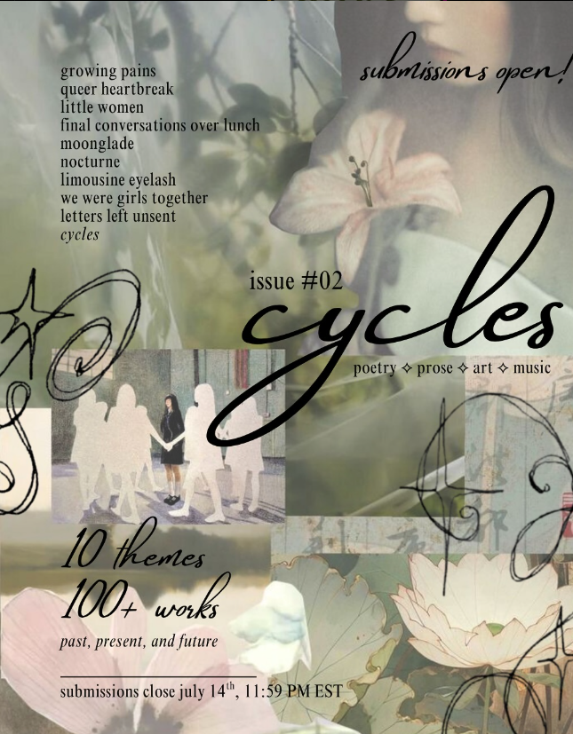 CYCLES by JUNIPER ZINE: Juniper Zine is looking for poetry, art, and music about growing up for their issue Cycles. They also have a Letters Left Unsent project looking for unfinished drafts and notebook snippets. The due date is July 14, 2025.