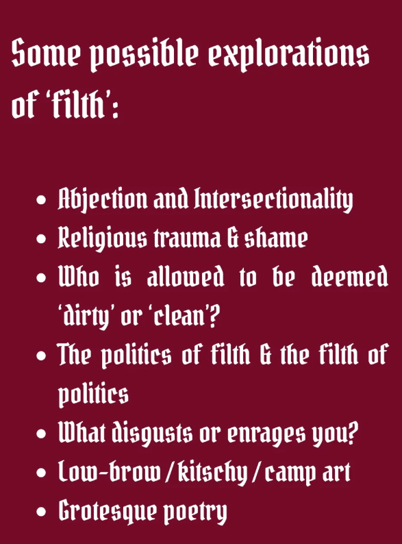 FILTH by FRENETIC: Frenetic is a leftist magazine based in the UK. They are looking for poetry and art that explores the theme of dirt and cleanliness. They are also looking for cover art for the issue. The deadline is August 1, 2025.