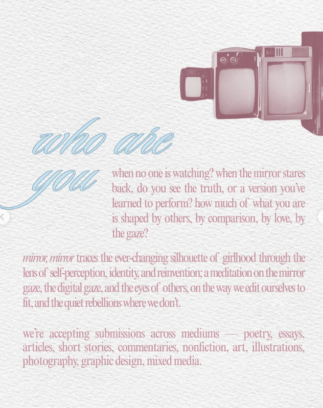 MIRROR, MIRROR by DOLCE ZINE: Dolce Zine is looking for a variety of media for their first issue. Submissions are due July 25, 2025.