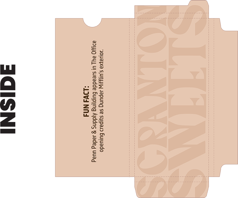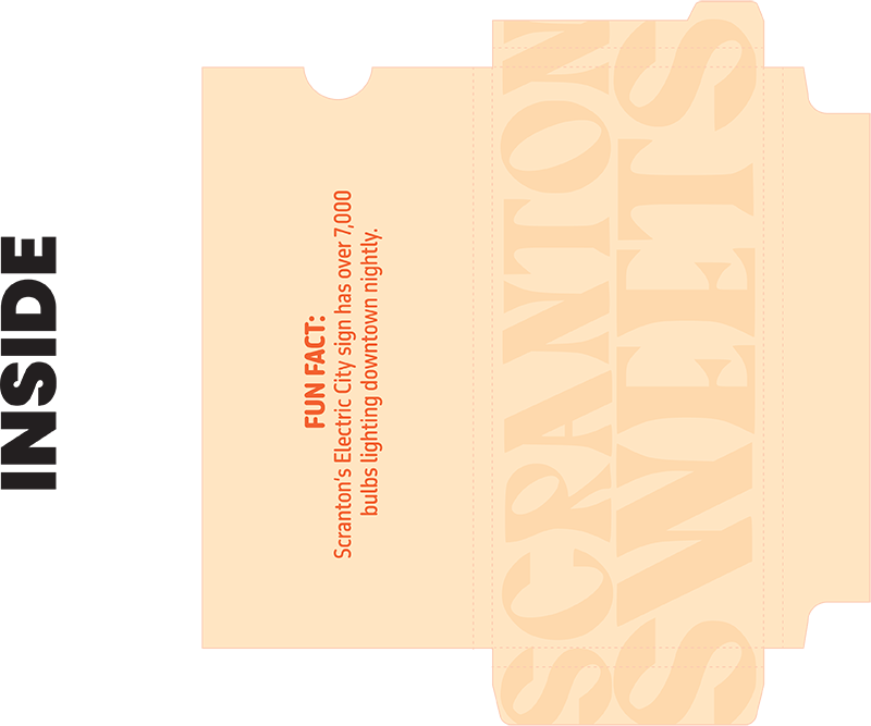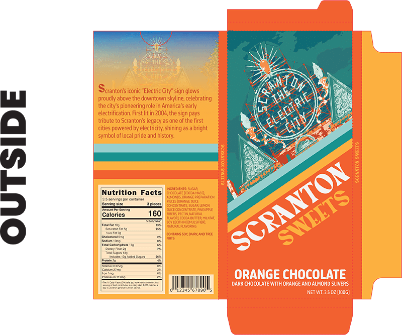 My idea for this project was to create novelty chocolate bars based on popular and iconic places in Scranton, PA. I thought this would be marketed towards locals, as well as tourists, who are in the area. I wanted to create colorful and engaging packaging that anyone would want to pick up and buy. Included on the packaging are some fun facts and information about each location to tie in with the Scranton connection. I took the Electric City Sign, the Penn Paper building, and Cooper’s Seafood House for my locations, and chose the flavors orange, dark, and sea salt chocolate. I wanted to tie the places and colors in with the flavors, so I thought these flavors matched perfectly.