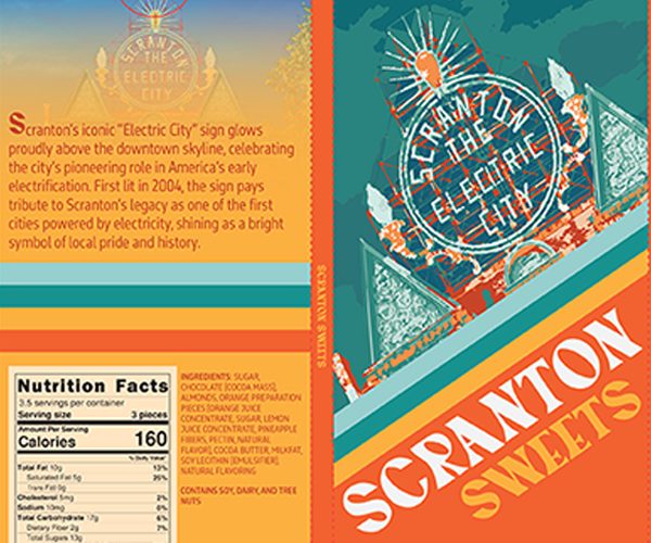 My idea for this project was to create novelty chocolate bars based on popular and iconic places in Scranton, PA. I thought this would be marketed towards locals, as well as tourists, who are in the area. I wanted to create colorful and engaging packaging that anyone would want to pick up and buy. Included on the packaging are some fun facts and information about each location to tie in with the Scranton connection. I took the Electric City Sign, the Penn Paper building, and Cooper’s Seafood House for my locations, and chose the flavors orange, dark, and sea salt chocolate. I wanted to tie the places and colors in with the flavors, so I thought these flavors matched perfectly.