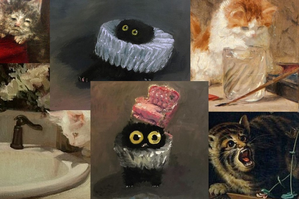 I somehow also stumbled on a bunch of cats being spoon-fed paintings. At first, I thought it probably was to show how they are a suitable replacement for real babies. Then, I found many website pages dedicated to this, basically a whole genre of spoon-fed cat paintings. I have yet to find a concrete reason why this was a thing. Please let me know if you find out because I am genuinely curious.