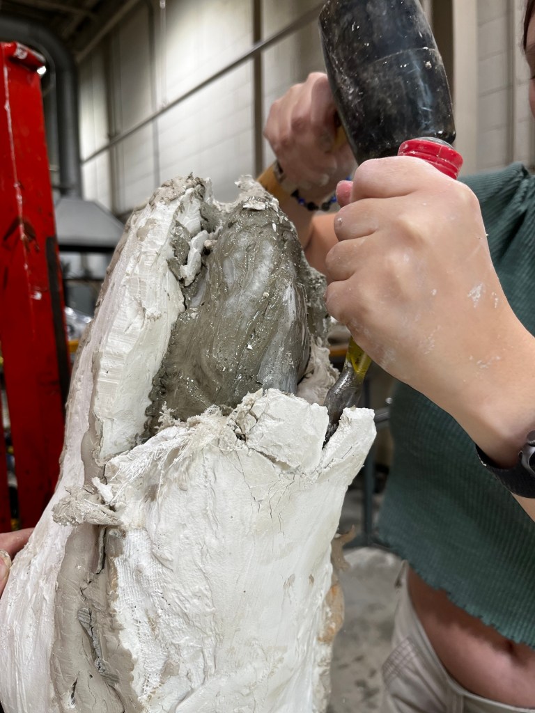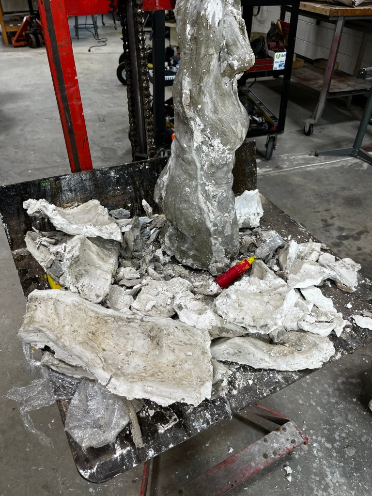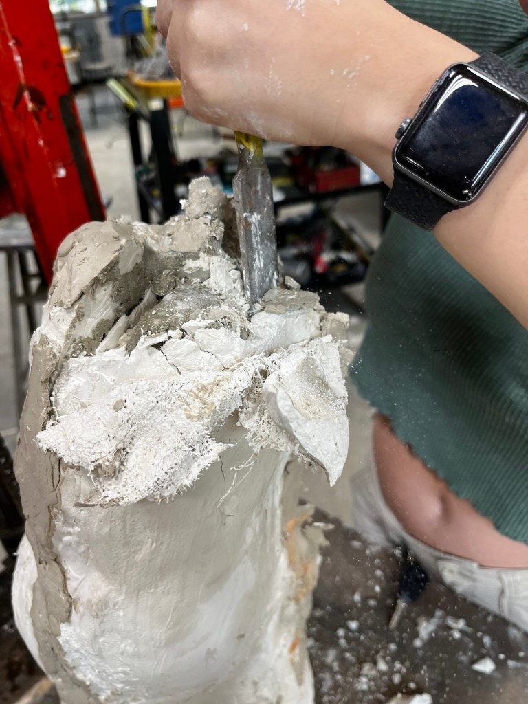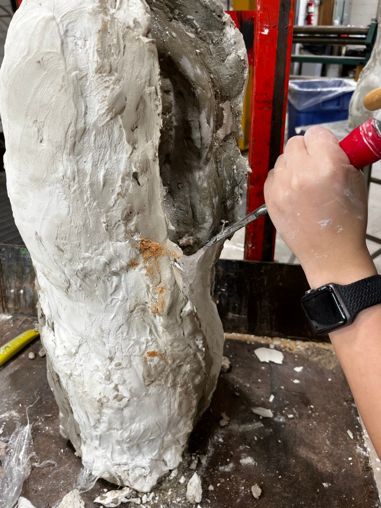 We were able to complete our molds and put them together to then pour cement into them. Since we poured cement our molds were “scrap molds” that we had to chisel away from the cement. This process took a decent bit of time. It was a little difficult to find a good place to start. Some pieces came off in big chunks while others were little pieces at a time. Once we got down to just little chunks that needed to be removed we had to be careful to not take out chunks of the cement with it.