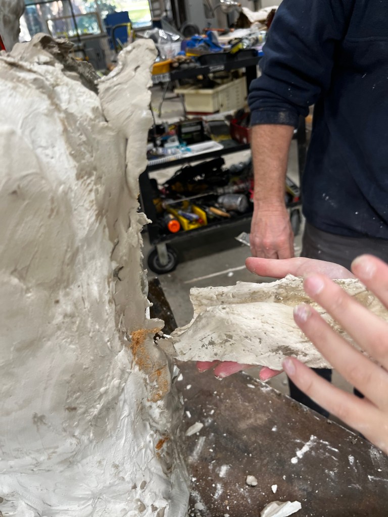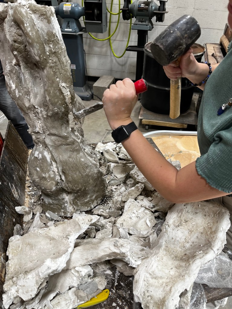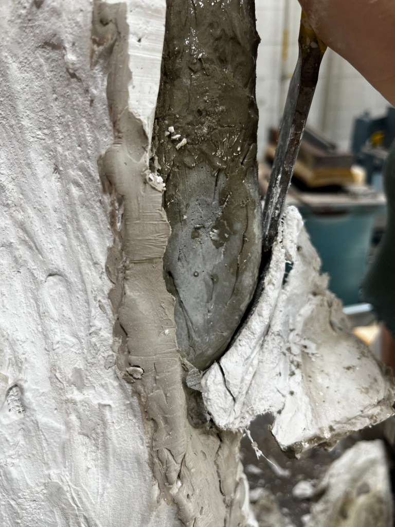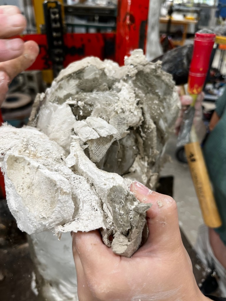 We were able to complete our molds and put them together to then pour cement into them. Since we poured cement our molds were “scrap molds” that we had to chisel away from the cement. This process took a decent bit of time. It was a little difficult to find a good place to start. Some pieces came off in big chunks while others were little pieces at a time. Once we got down to just little chunks that needed to be removed we had to be careful to not take out chunks of the cement with it.