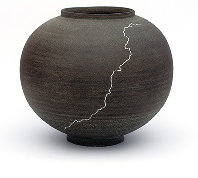 Adam takes the form, and meaning of the moon jar and pushes it further, playing with size as well as texture and color. He glazes many of his pieces in a haphazard method by splashing or throwing slip and glaze onto the bisqueware and then firing them in a wood kiln. He also scales up the size and creates jars that are more like cauldrons, able to fit several people inside. You can watch the methodical creation of these pots here.