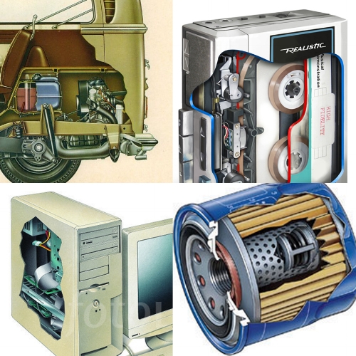 Clarks work stands out among others because of its truly original design. He incorporates mechanical pieces that move, spin, twist, slide or open/close and which function for a purpose. The design of his mugs, cups, tea pots etc., are based on a translation of “cutaway” diagrams. Those diagrams that illustrate a product and show it half assembled with a view into the inner workings, much like this: