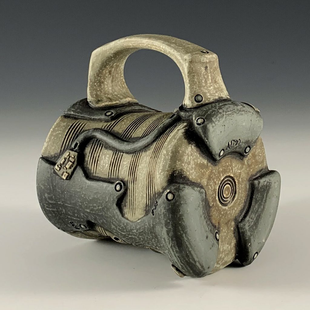Clark uses a process of manipulation after throwing his forms to end up with products that look like they’ve been slipcasted, not thrown. After throwing his initial forms on the wheel, Clark waits for them to dry partially, and then uses wood tools, forms, ribs, knives and all manner of instruments to finish the piece.