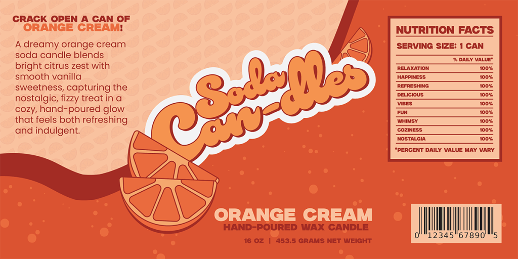 For my design, I was thinking of doing something that involved cans somehow, and I thought it would be a perfect idea to use candles as my product. So, putting those two ideas together, I came up with Soda Can-dles, which would be candles based on popular soda flavors. For my flavors, I chose Orange Cream, Vanilla Cashmere, and Cherry Cola, and then I based the color scheme of each label on the flavor. I only had to do one design for this project, but I thought it would be better to do three for a more complete set.
